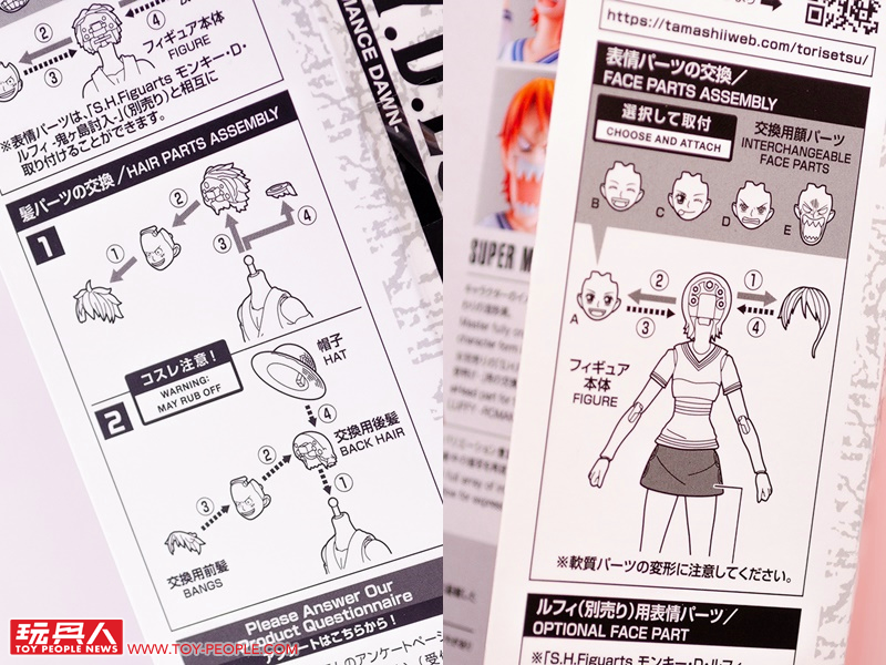 商品外包裝與近年商品相同採用開窗設計,讓人一眼就能看清楚遊玩方式與實際內容物。比較特別的是 S.H.Figuarts 商品近期將漸漸取消紙本說明書,並將簡易的說明印製在外盒側蓋上,減碳的同時也不會每次拿出來玩時都卡著一張紙,透過 QR CODE 或網址也能連結到 TAMASHII NATIONS 官網觀看電子說明書。