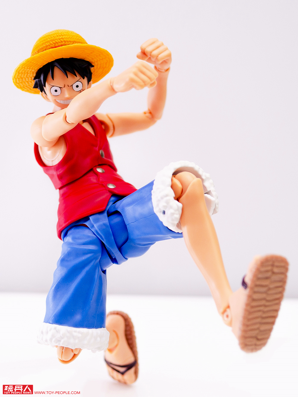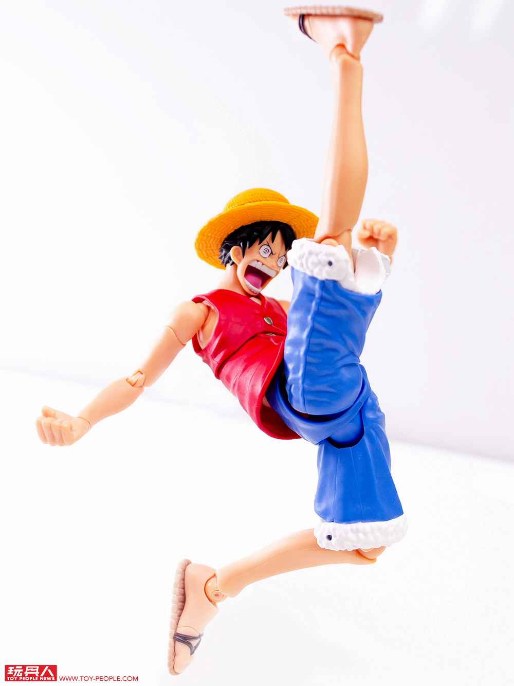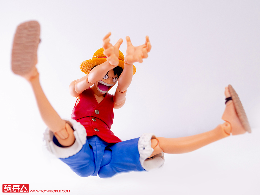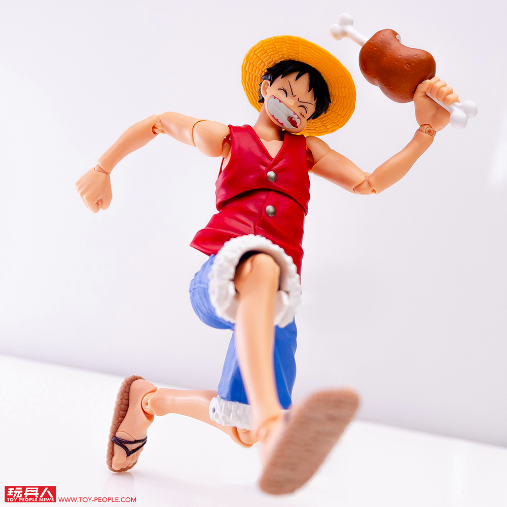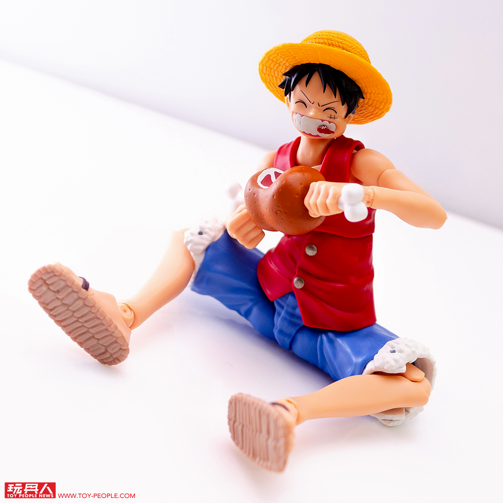 ▼ 活用 S.H.Figuarts 的可動關節設計和多種替換表情、手掌零件,就能把玩出劇中充滿躍動感的各種場景,像是高舉雙手大喊「我要成為航海王!」、滿足的啃肉模樣、施展「橡膠火箭砲」時充滿力量的姿態。