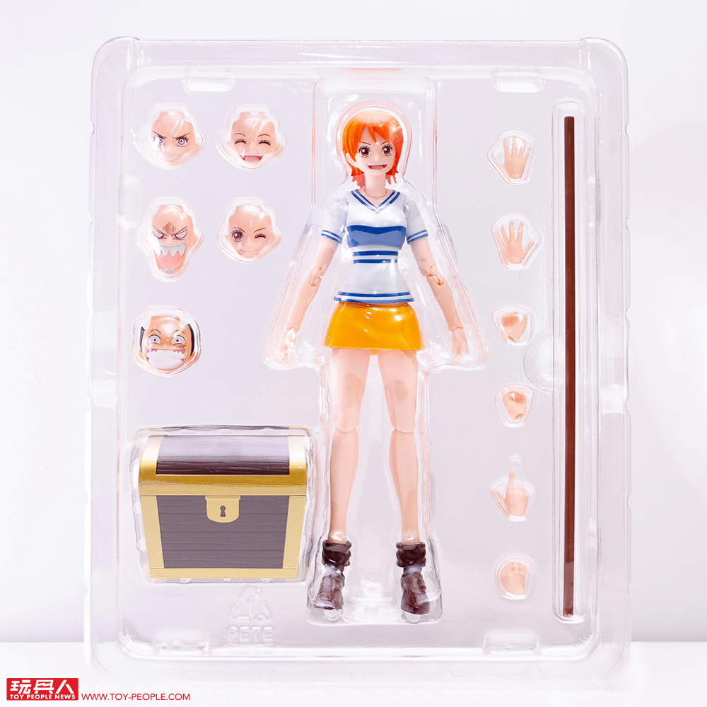 ▼ 第二盒「S.H.Figuarts 娜美 冒險的黎明」內容包含娜美本體、四種替換表情、六種替換手掌、初期作為武器的棍棒、裝滿金銀財寶的寶箱,以及能讓「S.H.Figuarts 蒙奇・D・魯夫 冒險的黎明」使用的一款 BONUS 表情零件。