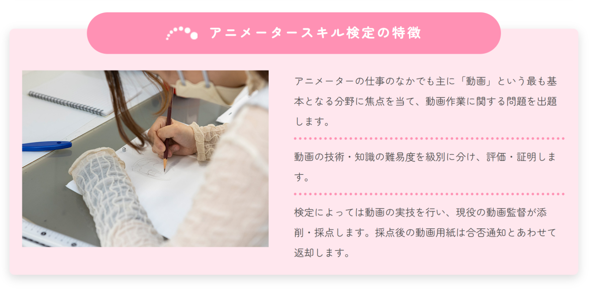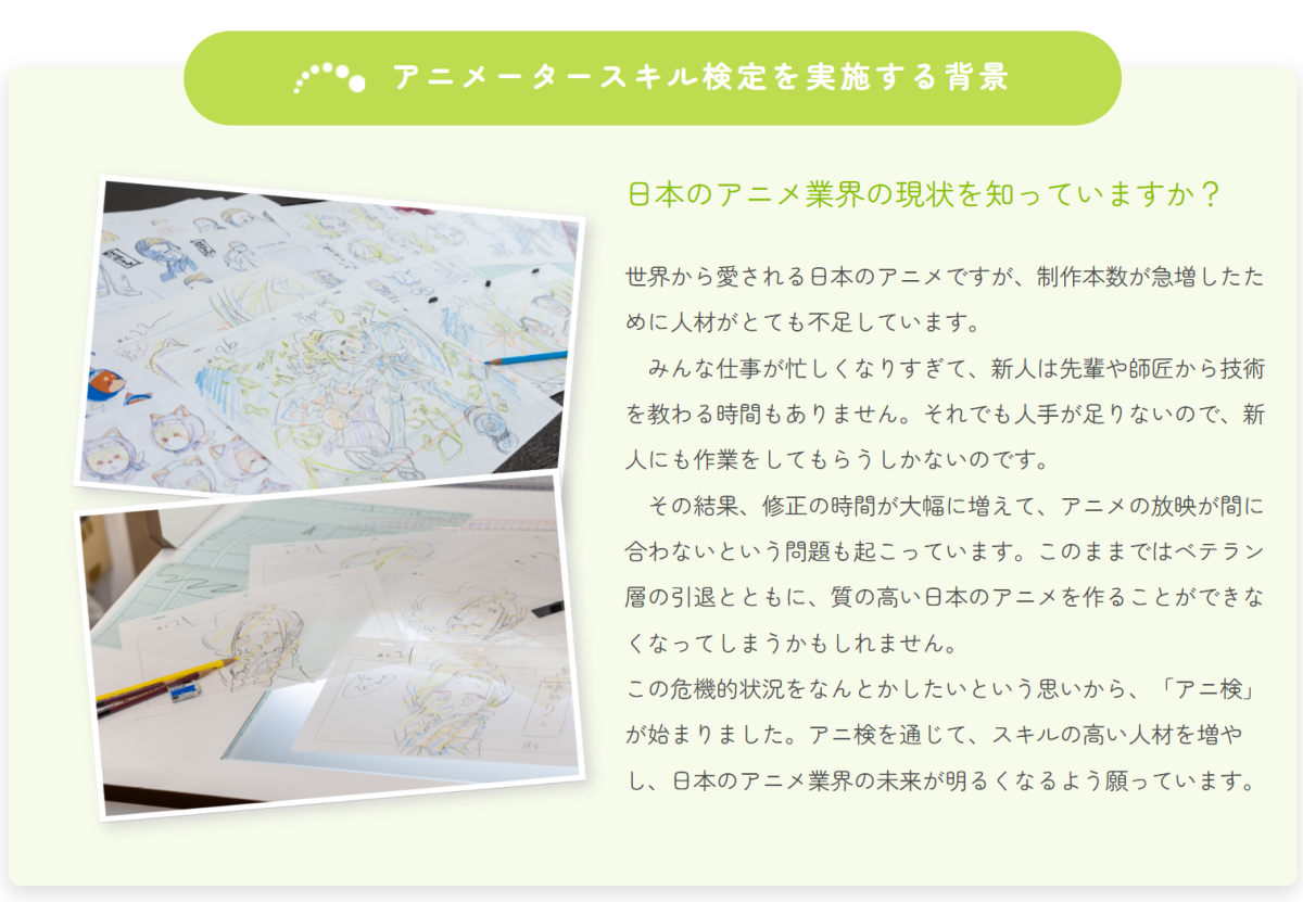 過去在日本一直都沒有相關的檢定考核,這工作也變成多為經驗考量或分包的情況。為了讓產業能夠有鑑別度,由一般社團法人「日本動畫電影文化聯盟(NAFCA)」首次策劃,評估動畫師基礎技能的「動畫師技能檢定(アニ検)」正式在今年 11 月 9 日舉辦,吸引約 350 人投入檢定,不少資深動畫師也來嘗試,認為這是重大的業界創舉。