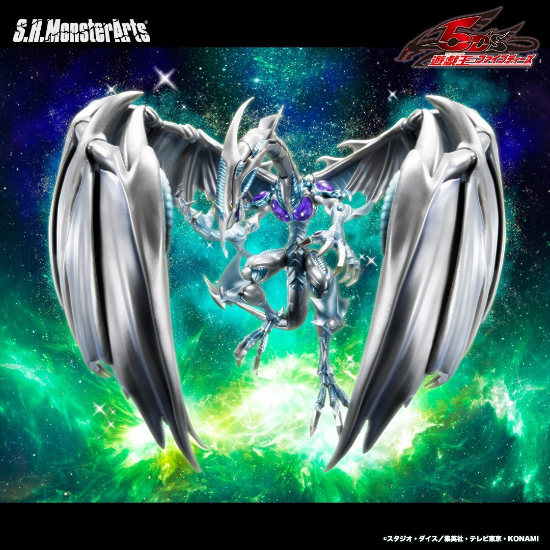 使用從 S.H.Figuarts 系列中培養出的可動(Action)模型技術,專精於「怪獸(Monster)」的可動模型系列「S.H.MonsterArts」,以《遊戲王》為主題推出的第五彈商品「S.H.MonsterArts 星塵龍」,打造出星塵龍特徵的藍銀巨大雙翼,並細膩刻畫出兇猛的頭部造型,以及軀體複雜紋路、銳利的線條等細節;胸部與肩膀等處使用透明零件來表達透光感,強勁的翅膀、爪子等處施以散發金屬感的珍珠光塗裝,表現出星塵龍的光芒與壓倒性的霸氣!更多詳細的販售資訊將於日後公開。