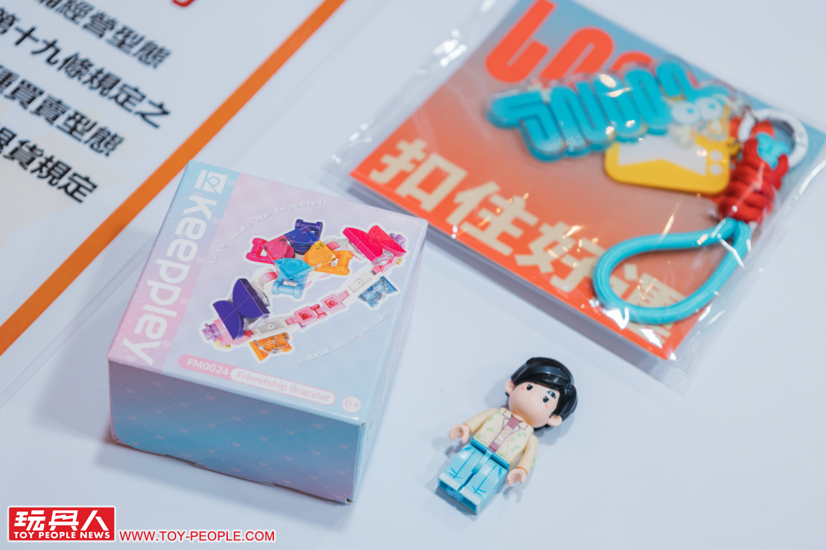 本次【Keepplay奇妙積木之旅】活動現場的贈品一覽:組裝積木手環(左)、會場消費滿 1,500 台幣的壓克力手環(右上),以及會場消費(不限金額)並出示周杰倫演唱會票根、購票憑據,或是參與周杰倫演唱會照片就能獲得的周同學積木人偶!