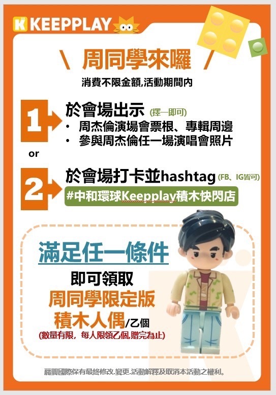 沒能參加周杰倫演唱會的粉絲們也別傷心,只要來到『Keepplay奇妙積木之旅』現場消費,不限金額打卡標記#中和環球keepplay積木快閃店,也同樣能獲得周同學積木人偶~