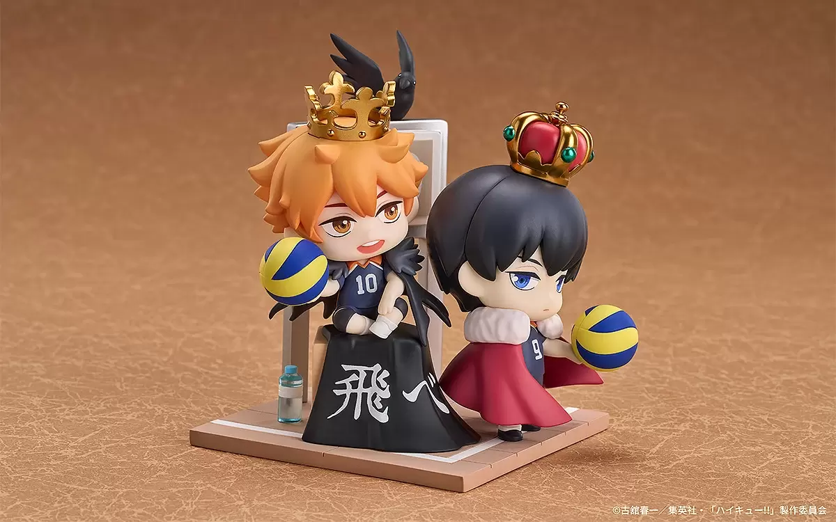 擁有可愛設計的『Qset+』系列,以原作為基礎構想,將角色形象的與劇中情境化為 Q 版模型,小巧尺寸讓喜愛場景感的玩具人可以易於在桌上擺飾,時刻陪伴。本次推出的「Qset+ 日向翔陽/影山飛雄」,尺寸約高 105 mm,將兩人在10周年紀念插畫中的王者造型可愛立體化~在二頭身比例中呈現頭帶王冠身披烏鴉披風的日向、華麗皇冠與紅披風的影山!場景還有代表烏野高中的烏鴉與飛べ隊旗。