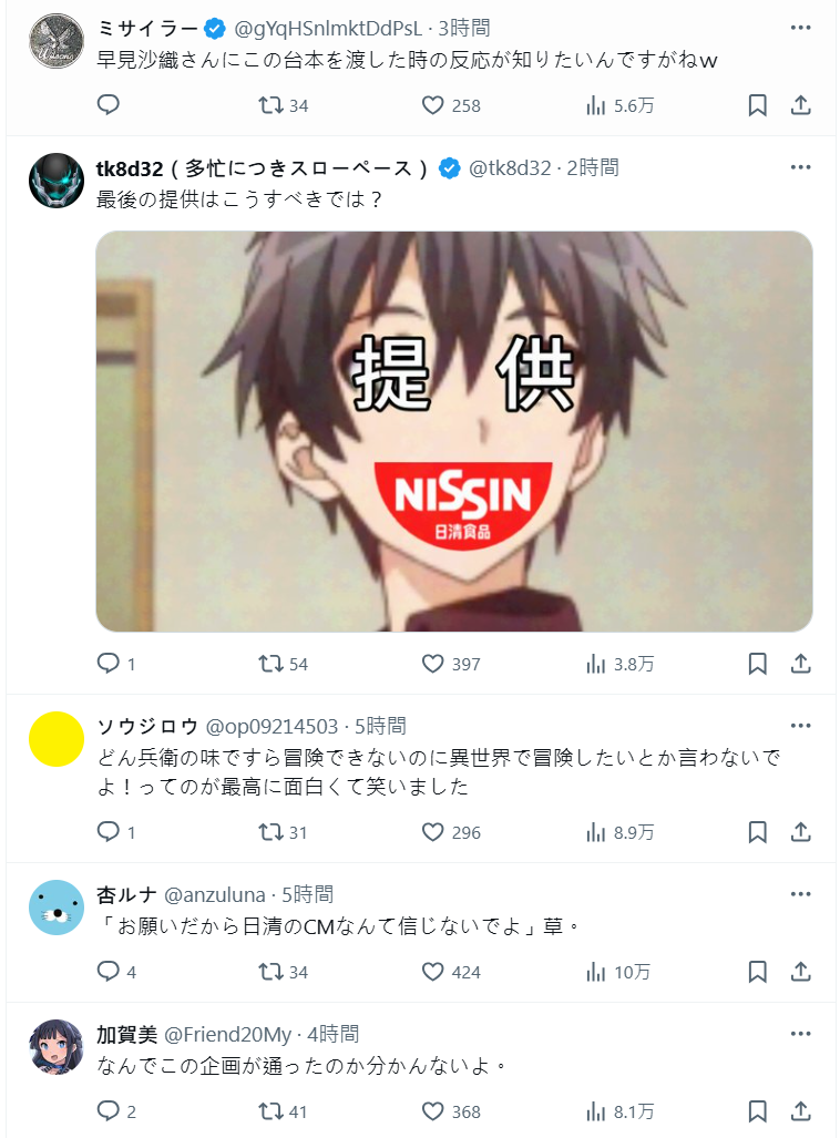 日清的創意一直以來都讓人無法預測,網友也開玩笑說真不知道早見拿到這堆台詞的時候到底在想什麼 ...www。