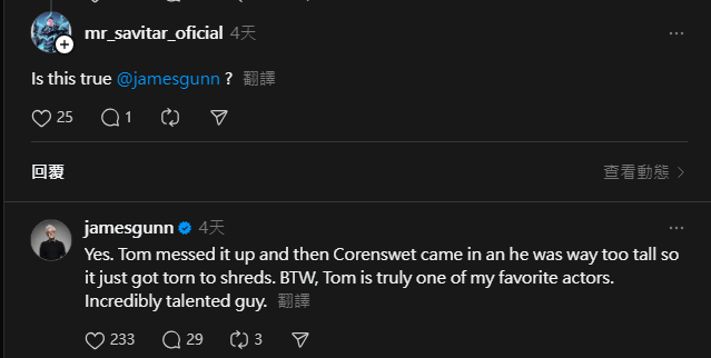 當然,實際上弄壞這件戰袍的並非詹姆斯·岡恩本人。近日,有粉絲在Threads 上詢問岡恩,參與試鏡的湯姆·布里特尼(Tom Brittney)是否真的如他所說,在試鏡的時候穿壞了亨利·卡維爾的超人服裝。對此,岡恩便回應道: