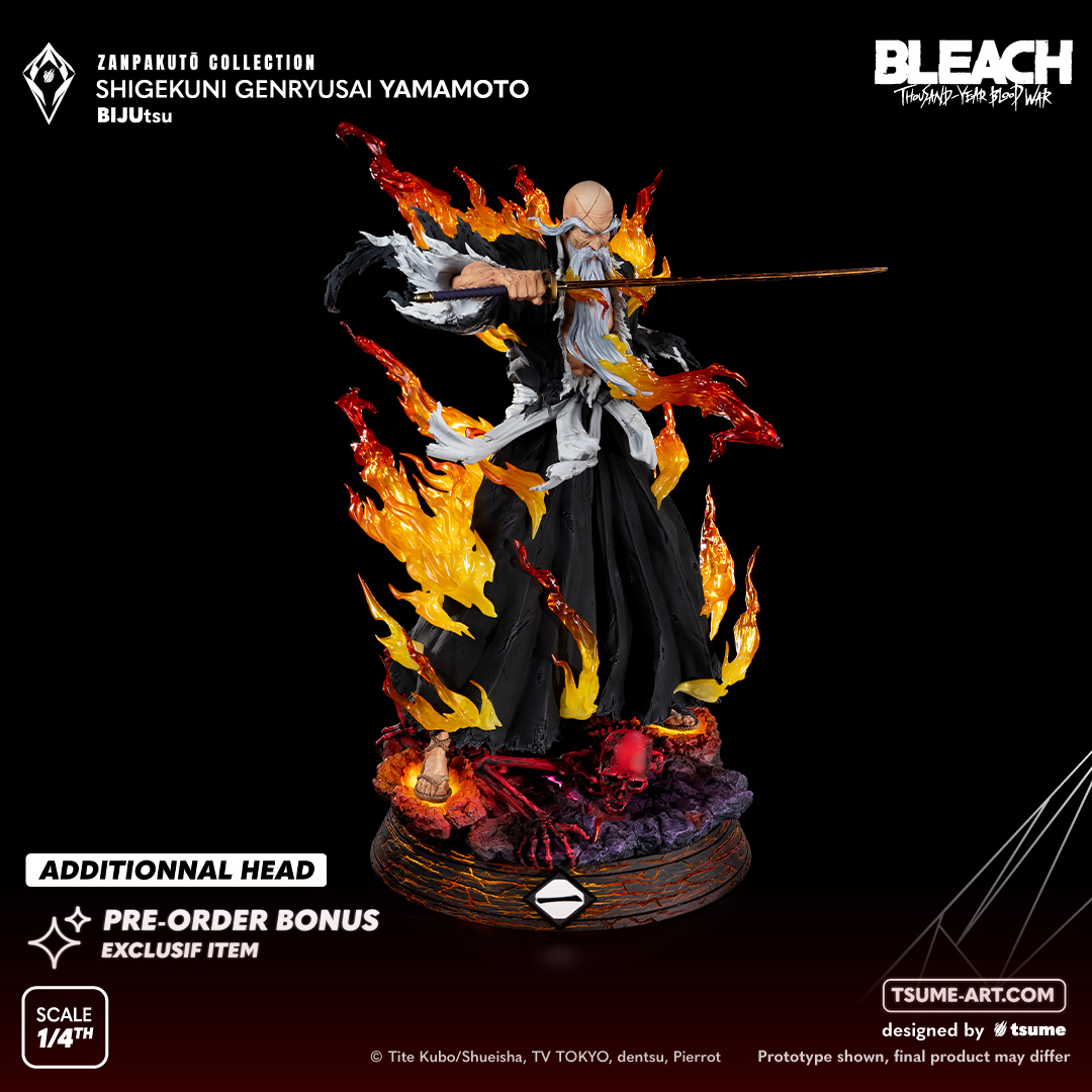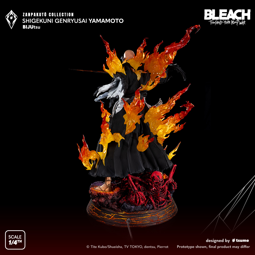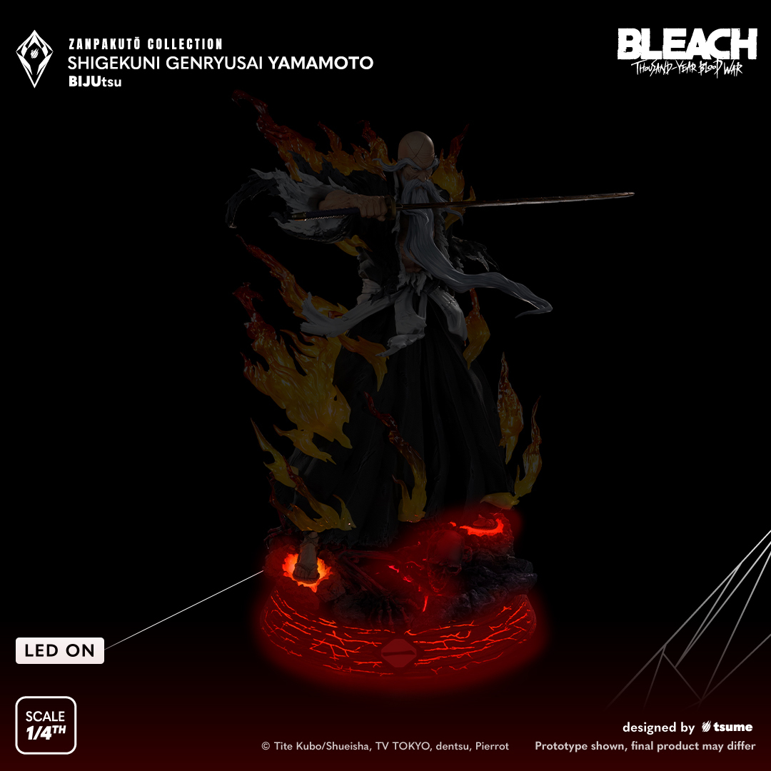 山本元柳齋重國,護廷十三隊創始人、首任總隊長,被譽為「屍魂界最強死神」、更被認為是等同於屍魂界歷史之人,擁有火炎系最強且最古老的斬魄刀「流刃若火」,一出招就是炸翻全場,又帥又強。本次 Tsume-Art 製作的「元柳齋」高約 54 公分,採用 Polystone、金屬為材料製作,展現他右手持握斬魄刀、全身被火焰包圍的霸氣造型,讓人聯想到招式「殘火太刀·西·殘日獄衣」,從額頭的傷痕、銳利的眼神、飛揚的花白鬍子、破損的死神裝束,到千錘百鍊且佈滿戰鬥痕跡的肉體都施以高度造型力還原。