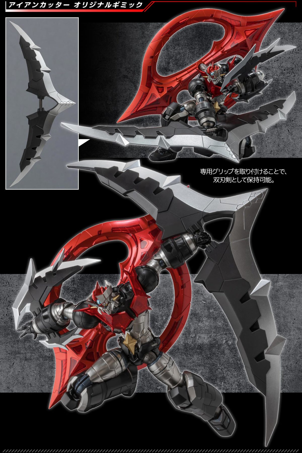 商品中最引人注目的就是全長近 36 公分的「巨大金剛飛刀」,運用 ABS 材質保持銳利造型並減少重量,可讓無敵鐵金剛 ZERO 單手裝備。同時搭載模型原創的分離機構,能夠拆解成兩把巨劍進行戰鬥。