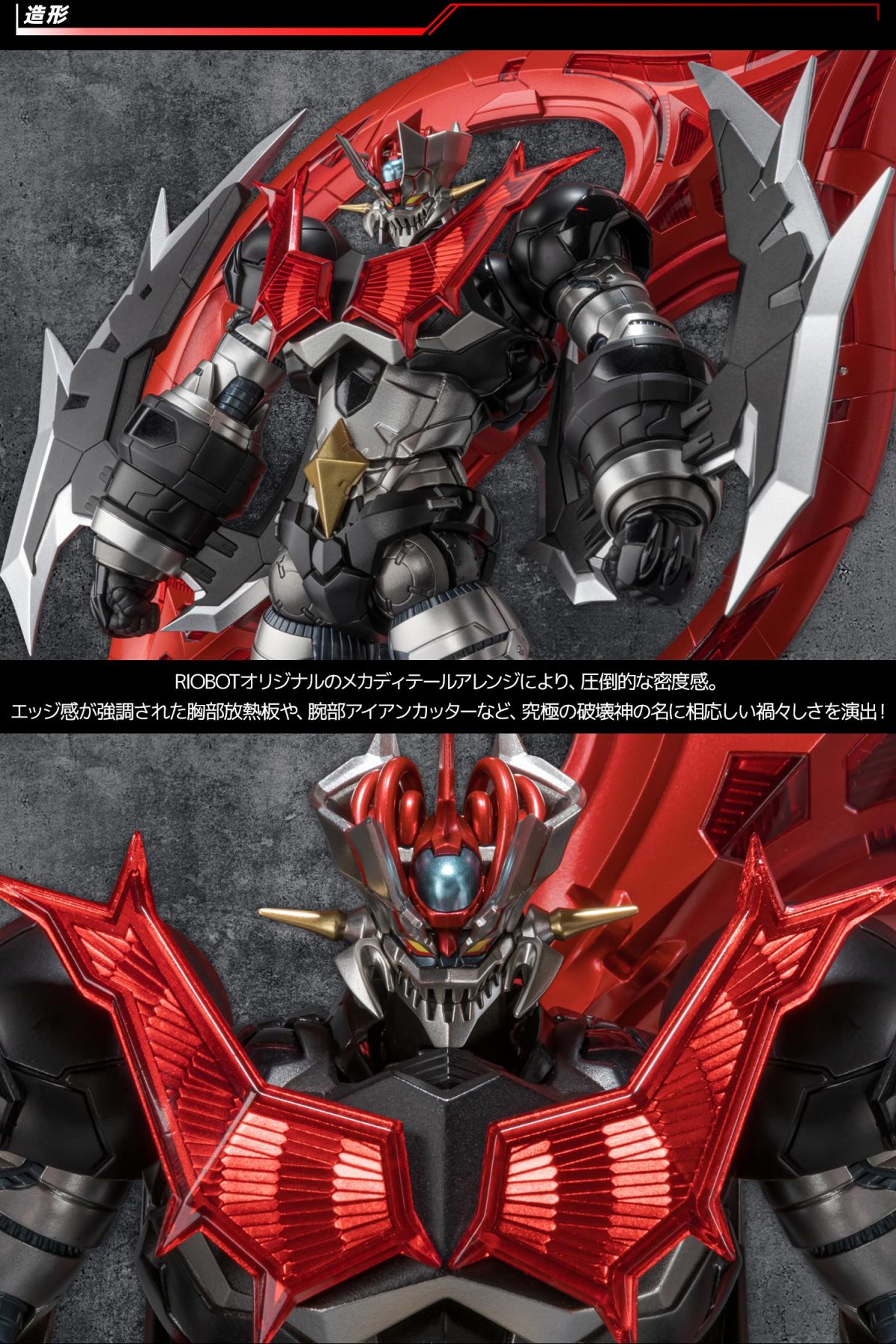 「RIOBOT 無敵鐵金剛ZERO」繼承過去無敵鐵金剛凱薩、鐵金剛皇帝G等商品所培育的設計技術與風格,以全高約 26.5 公分的魄力尺寸呈現這架終焉魔神。裝甲表現出胸口放熱板、雙腕金剛飛刀的銳利線條,並細膩刻畫出高密度細節。