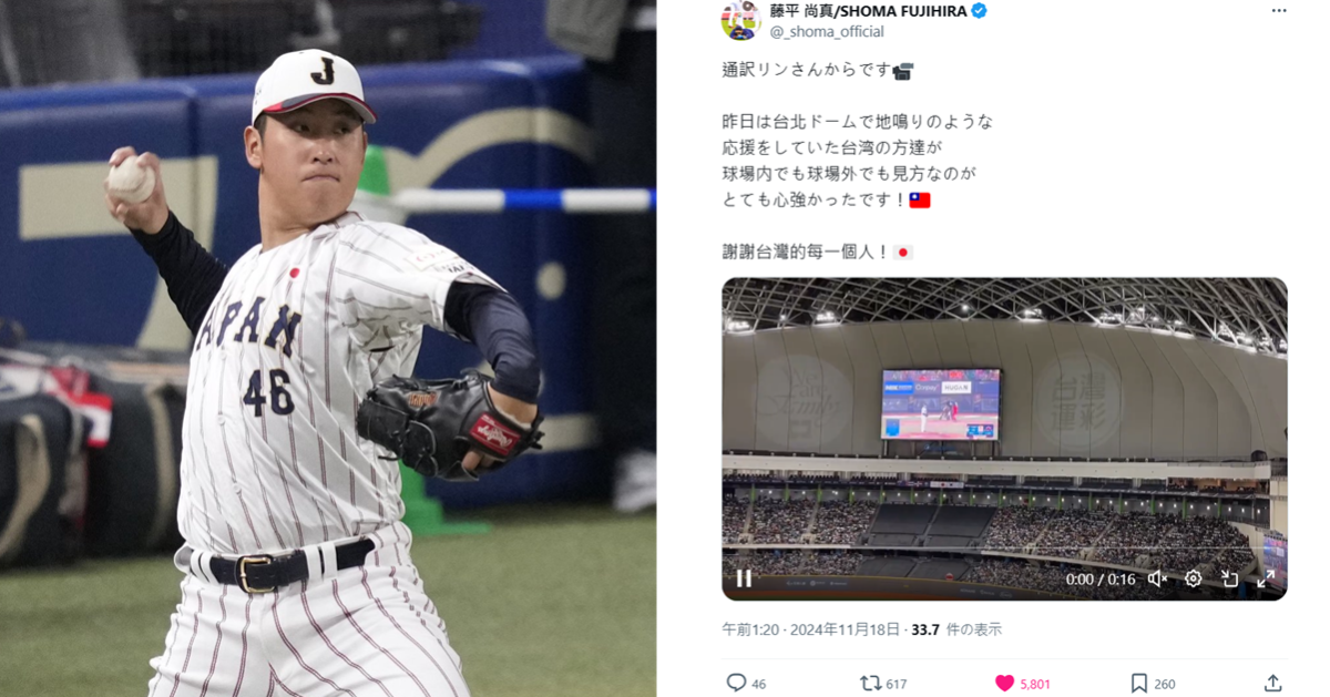 不只球迷,連第九局面對危機的後援投手藤平尚真也在 X 上透過翻譯發文,表示雖然無法看到現場,卻發現比賽當下大巨蛋台灣的球迷替他加油應援,在場內場外都展現了像地鳴般的熱烈支持,讓人感受到滿滿的力量,真的非常令人安心!謝謝台灣的每一個人。