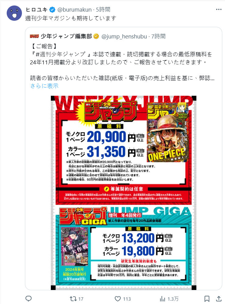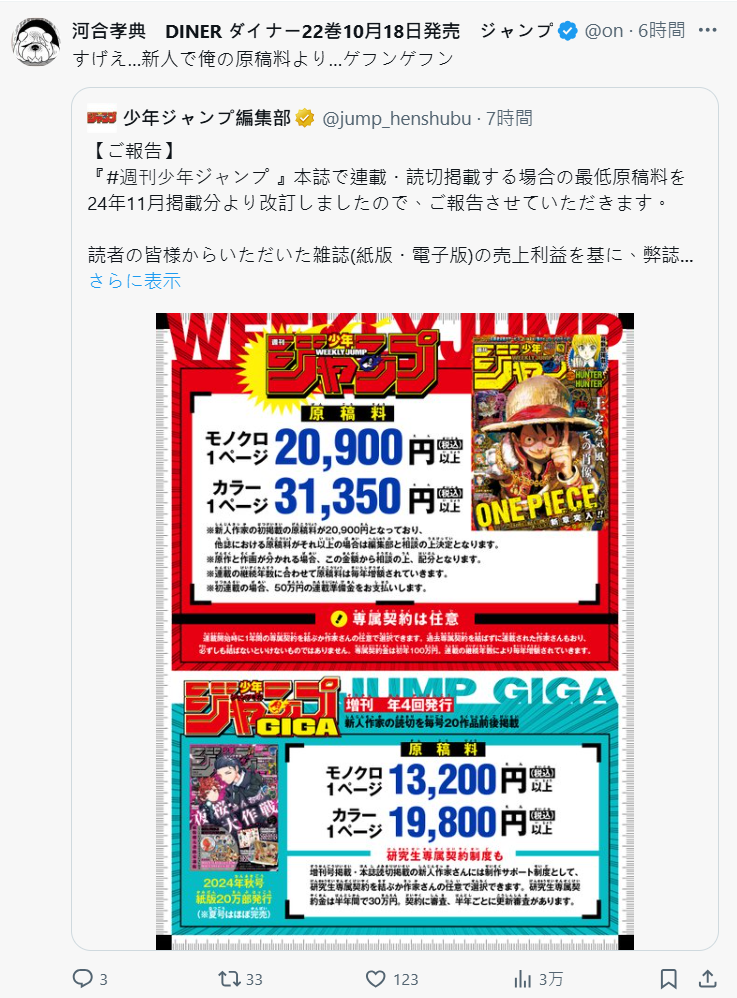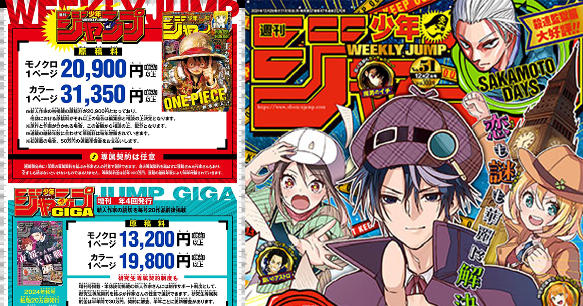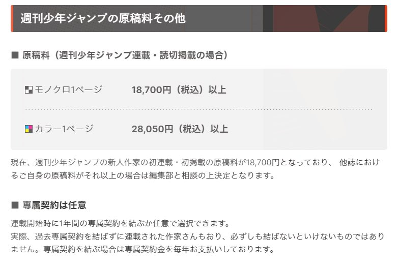 根據去年公布的《週刊少年Jump》稿費標準:黑白稿每頁 18,700 日圓以上,彩稿每頁 28,050 日圓以上。今年度則進一步提升,黑白稿每頁調整為 20,900 日圓以上,彩稿每頁則為 31,350 日圓以上,與此前相比,兩者均提升了超過10%。