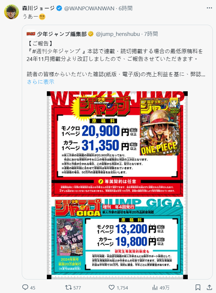 根據 JUMP 編輯部發文,表示本誌自 2024 年 11 月刊載內容起,已調整連載與單篇刊載的最低稿費標準。也將繼續根據讀者們支持紙本與電子版雜誌所帶來的銷售收益,持續改善本誌作家的創作環境,並適時進行調整。