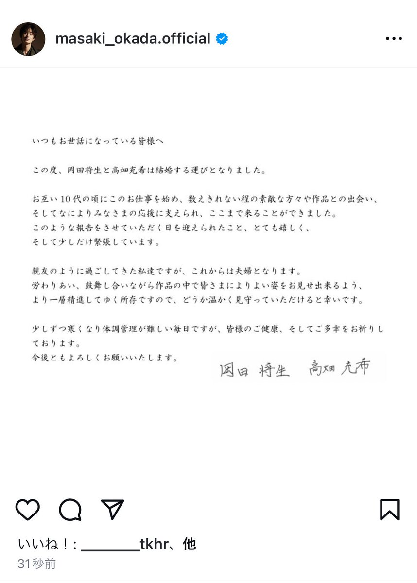 岡田將生的 instagram 上也發文表示,兩人都是 10 幾歲很年輕就進入演藝圈,遇到了無數的作品與同仁,更重要的是有著大家的支持才能走到現在。