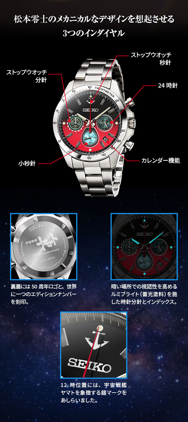 本款錶盤設計採用 3 眼配置,錶盤以黑色與紅色漸層呈現,描繪出漂浮在漆黑宇宙中的大和號船體,12 點鐘位置裝飾了宇宙戰艦大和號的象徵——錨形標誌,時針與分針也都採蓄光材質,黑暗中也能清楚辨識時間。