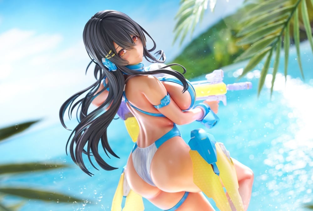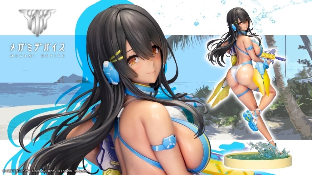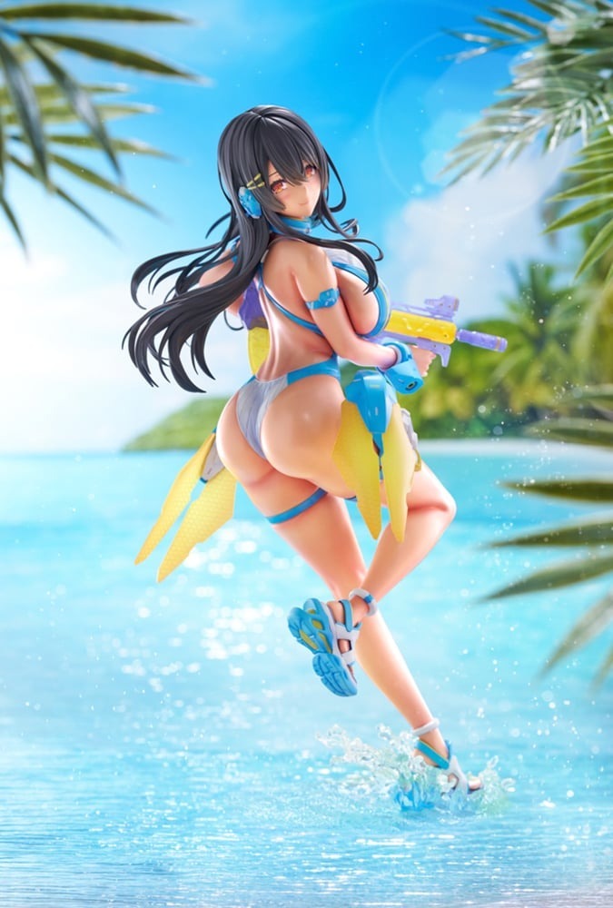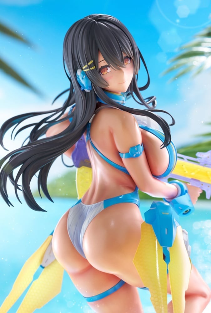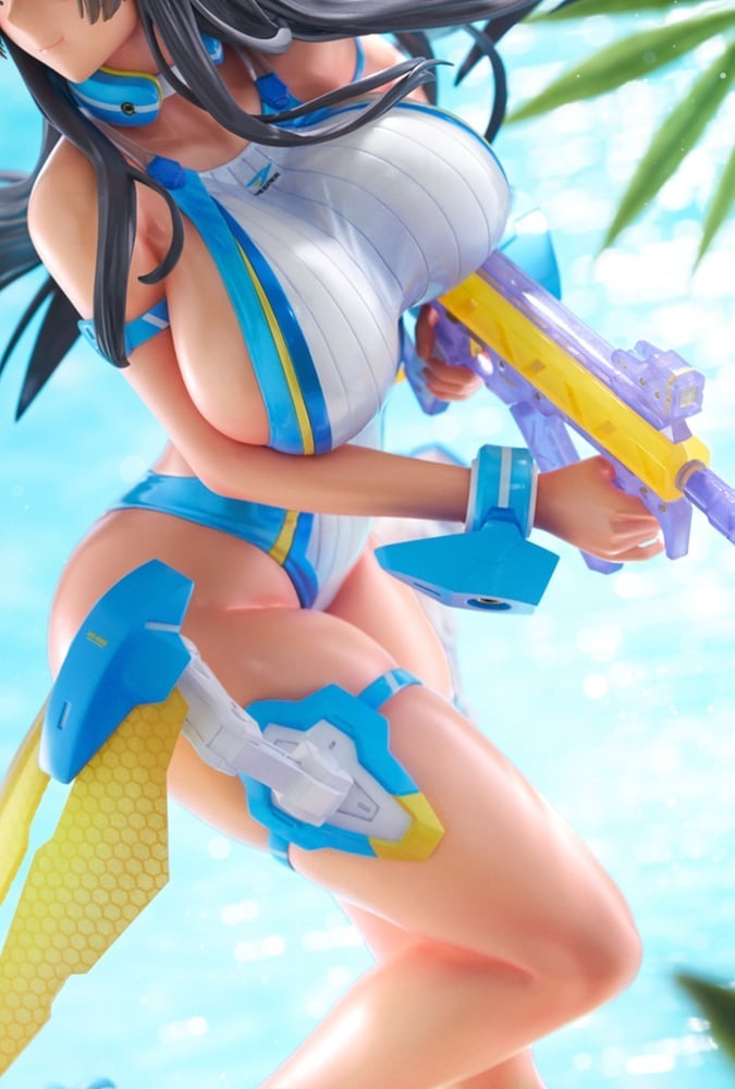 色彩部分也經由 Nidy-2D- 徹底監修,全身肌膚施以略有光澤的健康小麥色,搭配濺起水花的底座造型表現豔陽下溼潤的身軀。運用多數透明零件製作的水槍等武裝零件也運用豐富的色彩呈現,特別再現了大腿兩側裝甲內的蜂巢狀紋路。