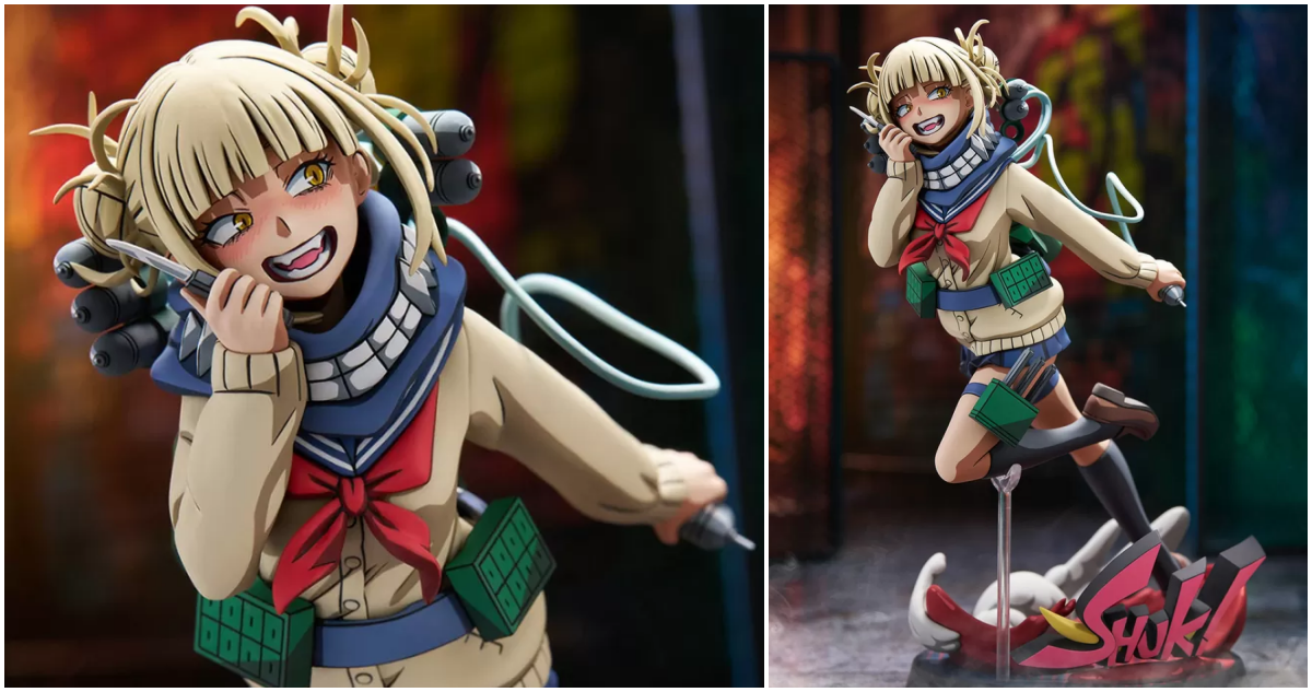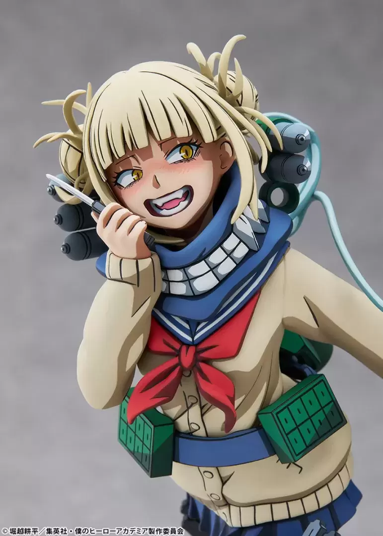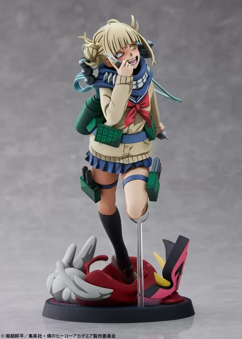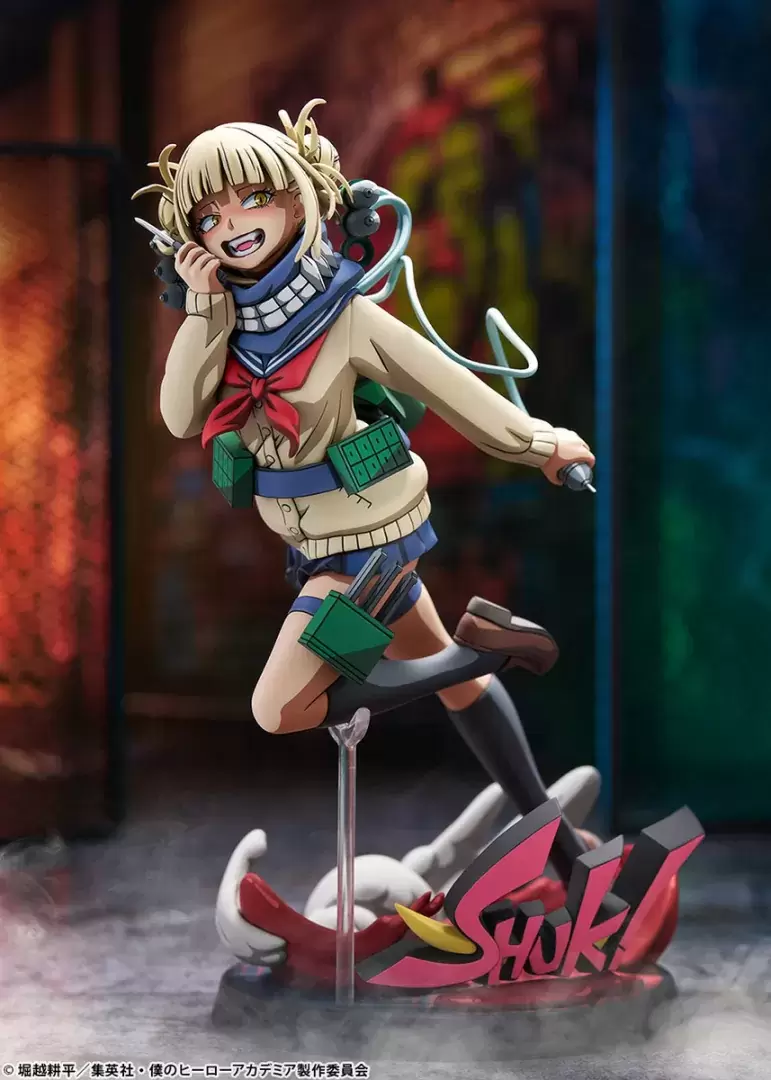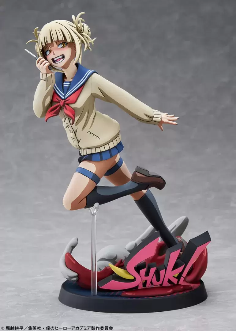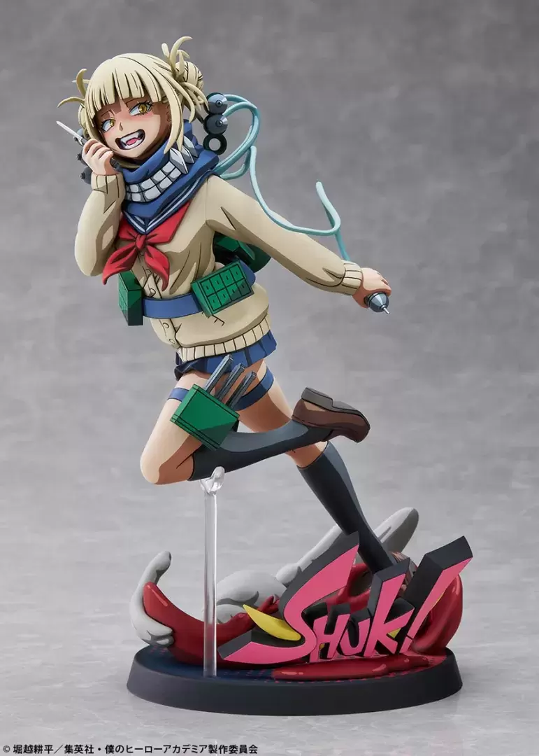 BellFine「渡我被身子 二次元化ver.」1/8比例塗裝完成模型,尺寸高約 21 公分,已發動個性的場景為基礎,吸入血液的注射器和小刀等武器部件都被忠實地再現,底座還設計有如血液濺起的特效件,搭配「SHUK!」的音效立體英文字樣,營造出《我的英雄學願》世界觀~塗裝更是採用平面色彩的 2D 化上色手法,透過仿筆觸的黑色線條與光影對比,呈現像是直接從動畫中跳出來的效果!