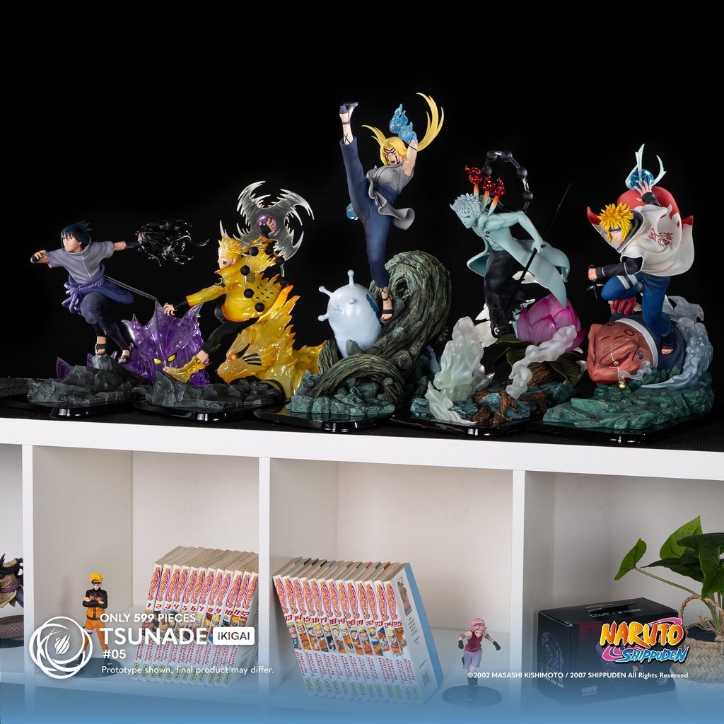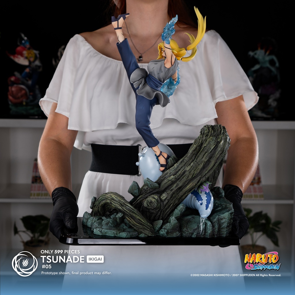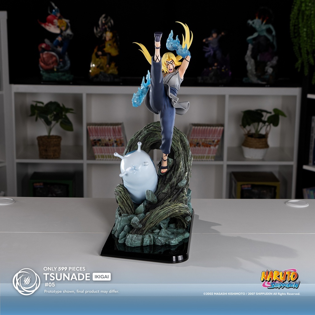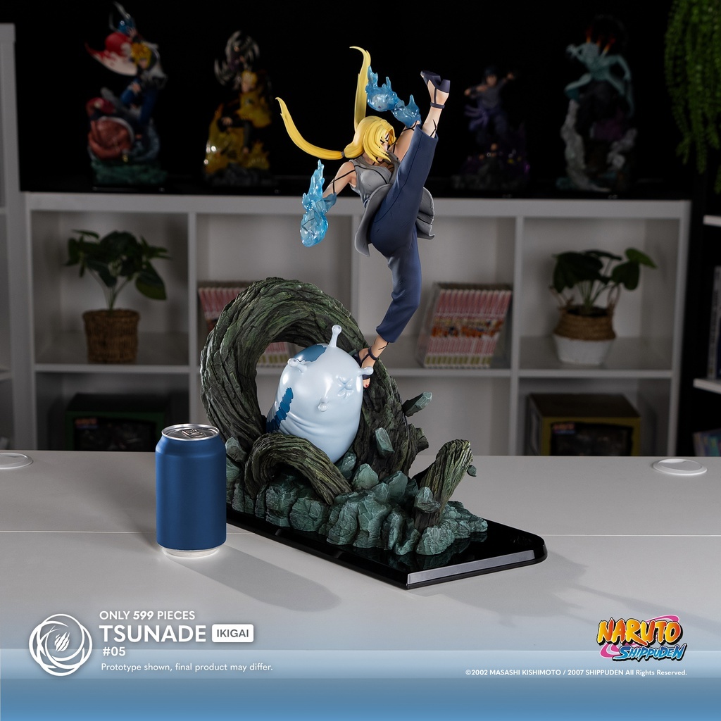 本次在 IKIGAI 系列立體化的綱手是在施展「陰封印・解 忍法創造再生」後、以經過大幅強化之身體能力戰鬥的造型,除了浮現在臉上與軀體各處、施展百豪術所呈現出的黑色紋路之外,雙手也被透藍色的查克拉特效件所包圍,加上高高舉起的右腿,彷彿正要往下方送出一記猛烈的重擊,而強烈舞動的服裝、飛揚的金色雙馬尾也進一步提升綱手本體的動作張力,當然,我們綱手奶奶偉大的胸懷也是完整製作出來。