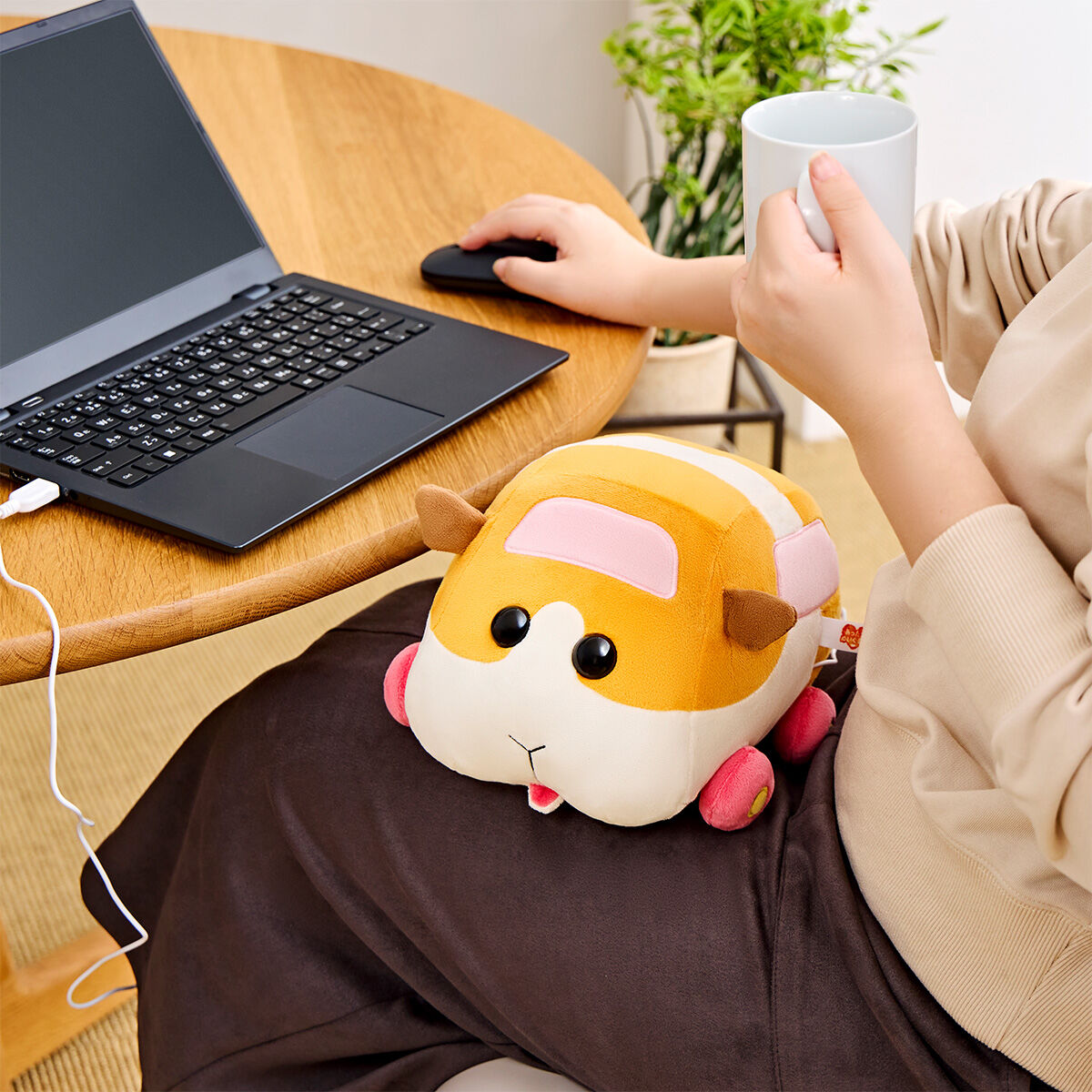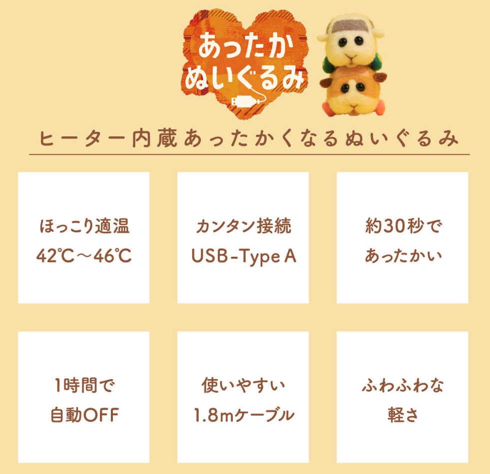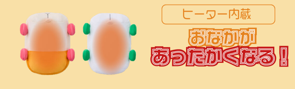 這款「暖暖絨毛娃娃」的特色在於,馬鈴薯、西羅摩的娃娃內建了 USB 加熱器。只需將附帶的 USB 線接上電源,約 30 秒就能感受到溫暖。加熱溫度設定在約 42 至 46 度,配上柔軟的觸感與療癒的玩偶彈性,讓人忍不住想一直抱著不放。