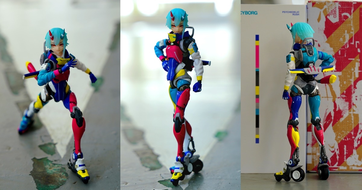 「PSYCHEDELIC RUSH」全身不規則地使用原色及螢光色,使其呈現出強烈鮮明的配色。與同系列商品相同,腳部和身上主要部位中的一部分採用壓鑄製作,實現機械質感及靈活的可動機關。MOTORED 身軀的形象更生動地被轉化為模型。行駛場景等動作也能自然擺出。