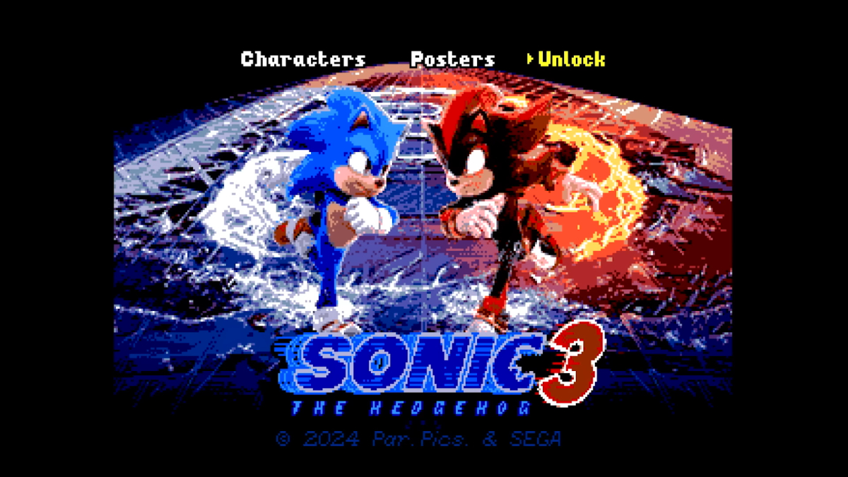 在主選單中,不僅可以看到以點陣圖呈現的《音速小子3》電影視覺影像外,上面的選單還包含了角色(Characters)、海報(Posters),以及遊戲開啟(Unlock)等三個選項。