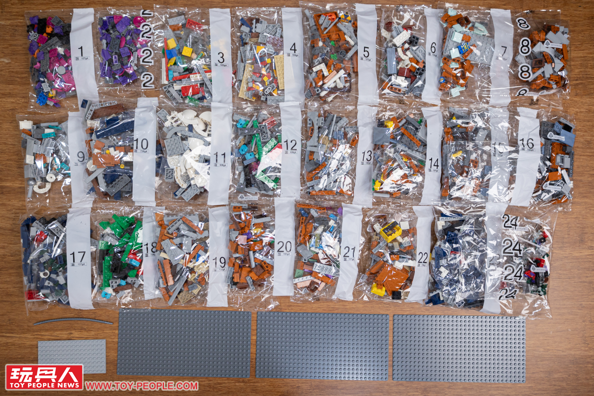 ▼ 拆開來看看內容物吧!一共 3093 片零件,包含 24 包編號零件、三塊深灰色底版、一塊較小的淺灰色底版,以及一條哨兵機器人用的軟管零件。