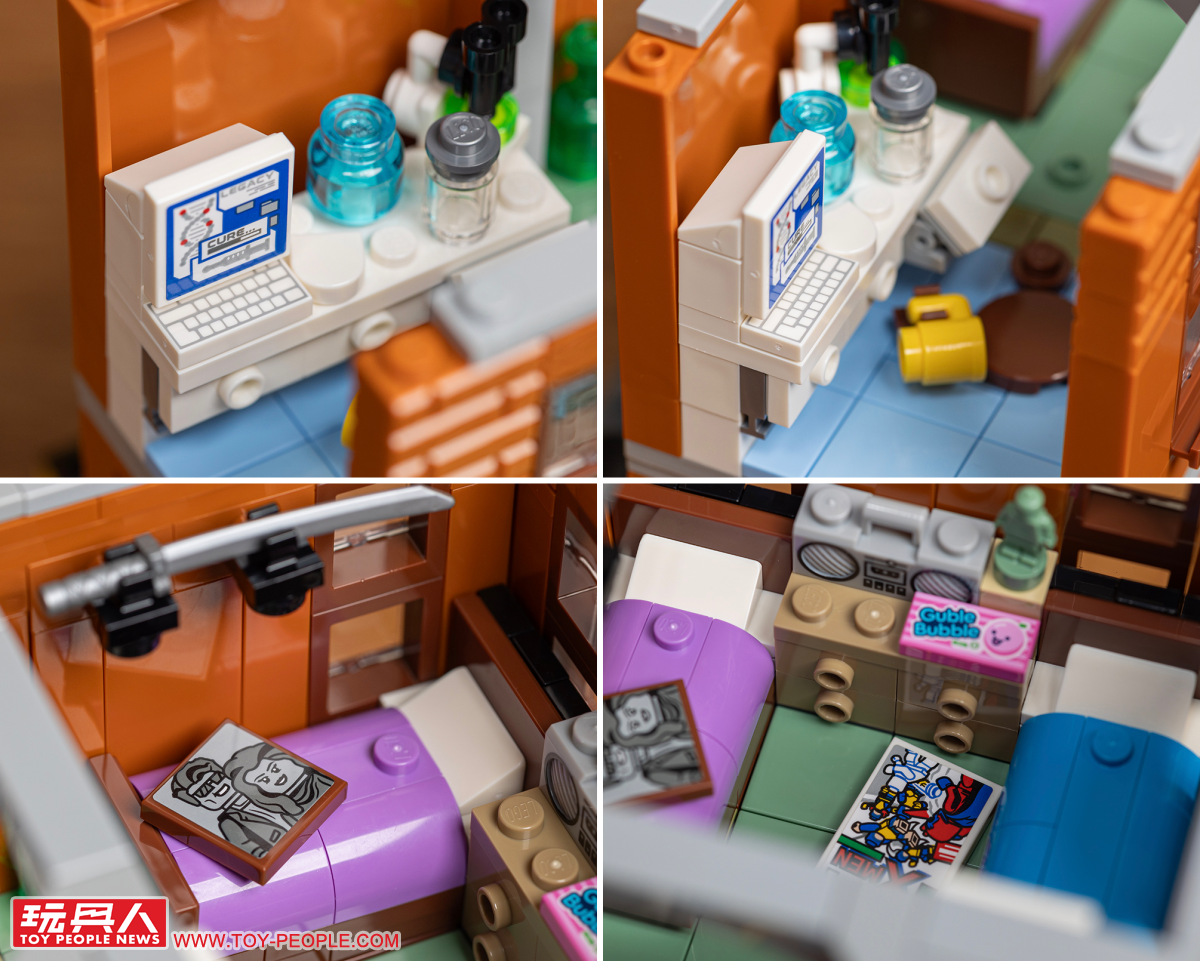 ▼ 二樓包含了金鋼狼臥室與醫學實驗室這兩個區域,實驗室這邊有著電腦、顯微鏡、瓶罐,金鋼狼的臥室則有那張令人心碎的「琴&獨眼龍」合照跟武士刀;而在這個金鋼狼的臥室中還有另一張床,從床頭櫃放著的泡泡糖包裝零件來看,室友難道是歡歡(Jubilee)?