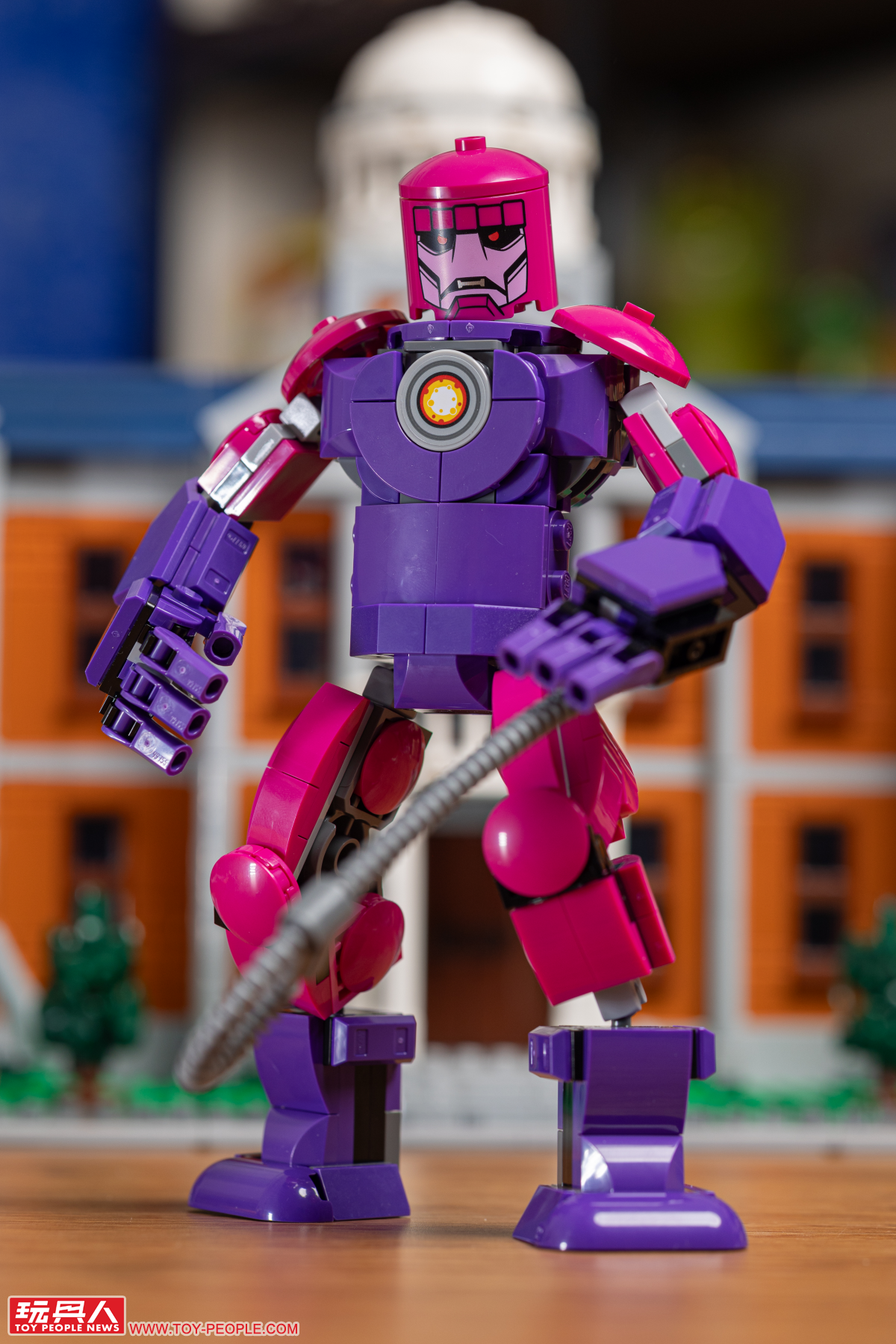 那麼,按照我們玩具人玩樂高的慣例,就是要先來看看那些組裝時令人興奮、組完後可能會被掩蓋或是容易漏掉的小細節。首先就是磚拼形式的哨兵機器人(Sentinels),這一用來狩獵變種人的恐怖機器重現了經典的配色與造型,腿部的勾勒相當不錯,整體雖然搭載了可動機構但幅度並不大,胸口的反應爐是貼紙,幸好頭部是印刷零件,不然貼歪真的就去了。