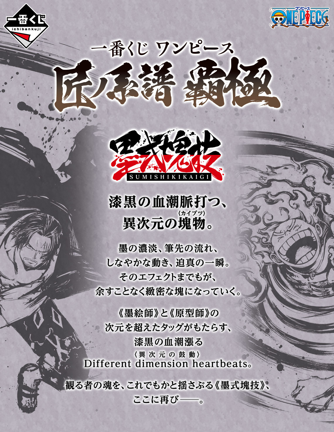 『一番賞 航海王 匠之系譜 霸極』,收錄以墨繪師×原型師為主打,擁有極高造型力與魄力的「墨式塊技」模型,再現揮墨的迫真一瞬!本次搶先公開的獎品包含有 A賞魯夫 橡膠白鞭、B賞紅髮傑克 神避,C賞索隆 黑繩大龍卷、D賞尤斯塔斯·基德 電磁砲、E賞珠寶·波妮 扭曲未來,以及最後賞的紅髮傑克 神避 墨式色ver.六款角色超魄力模型!除了躍動的姿勢、誇張的比例外更結合特效件,讓整體更具臨場感~其餘的獎品將於後續公開,請鎖定玩具人的報導。