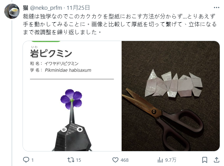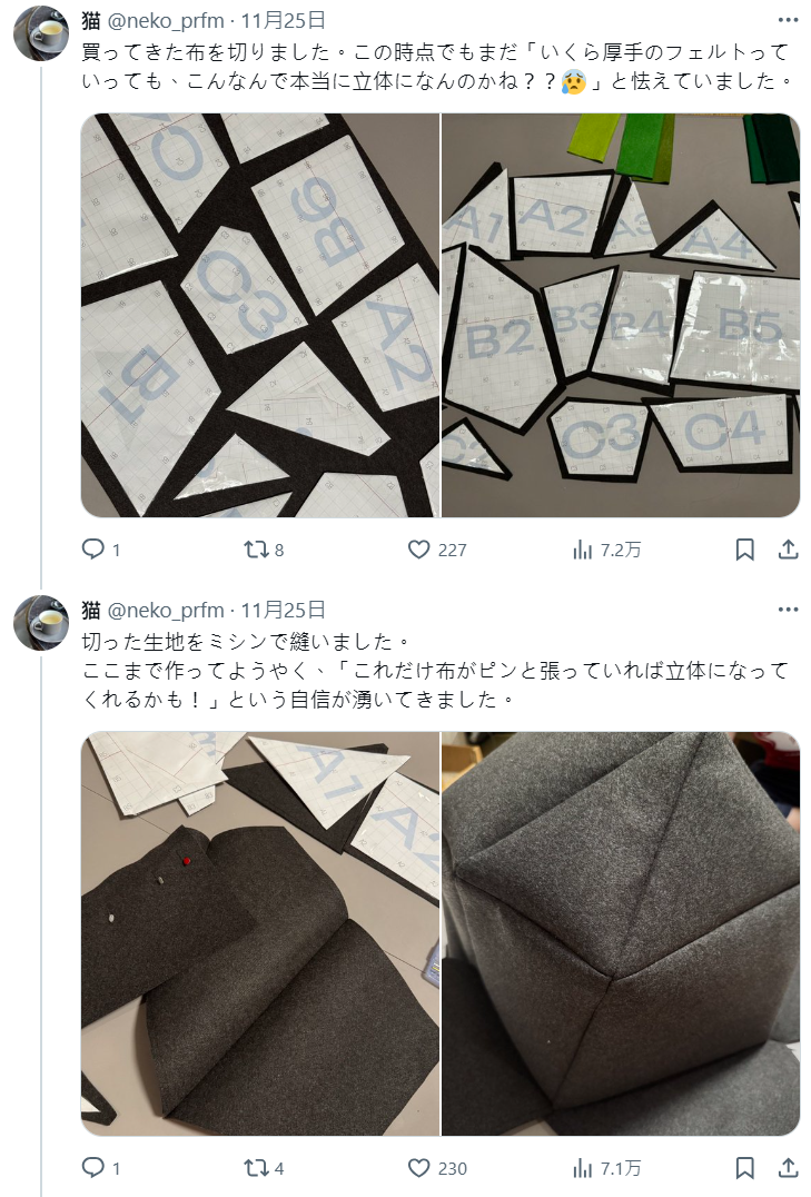 雖說獲得大量讚賞,但推主表示完全是自學裁縫,真的不知道該怎麼把這種有棱有角的造型轉成紙樣,最後只能硬著頭皮動手試試看。一邊對照圖片,一邊用厚紙板剪出各個部分,再將它們連接起來,不斷地微調到能夠組成立體結構為止。