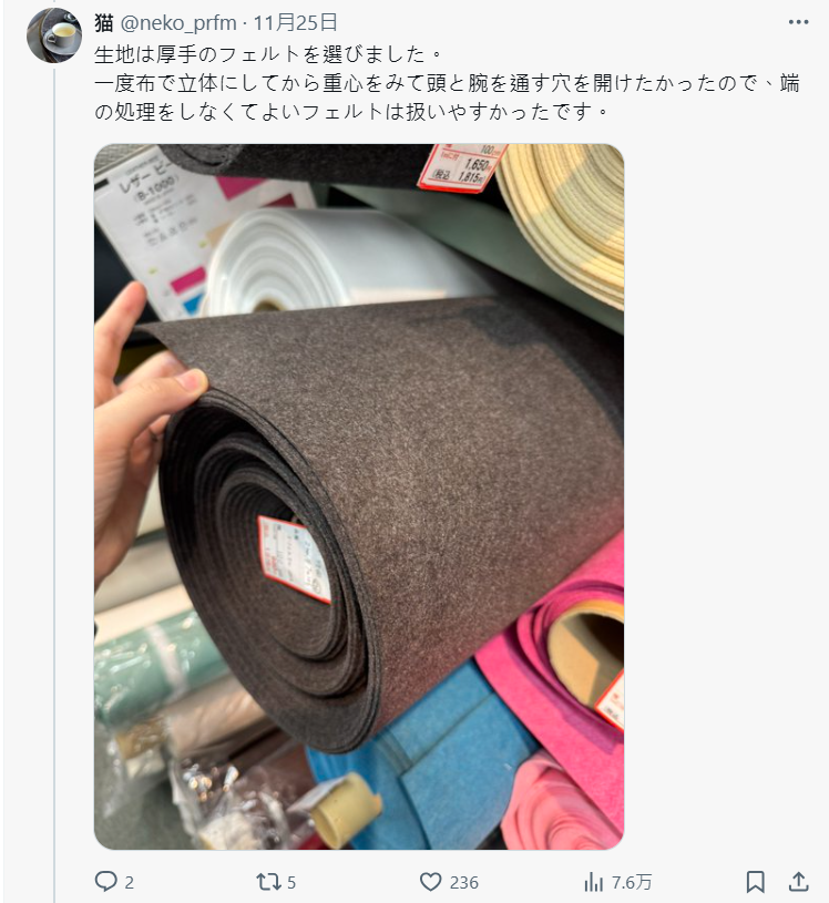選用了厚實的毛氈布料。因為想先把布料拼成立體結構,確認重心後再挖頭部和手臂的洞口,而毛氈不需要特別處理邊緣,讓整個過程方便很多。