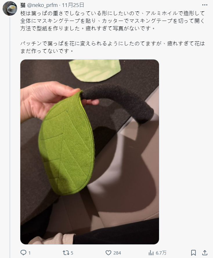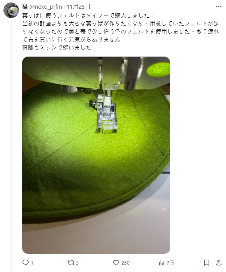 用來做葉子的毛氈是在 DAISO 大創買的。因為臨時想做更大的葉子,原本準備好的毛氈不夠用了,最後只能勉強用正反面顏色不同的布料來拼湊。當時已經累到完全沒力氣再去買布。葉脈部分也用縫紉機車了出來。