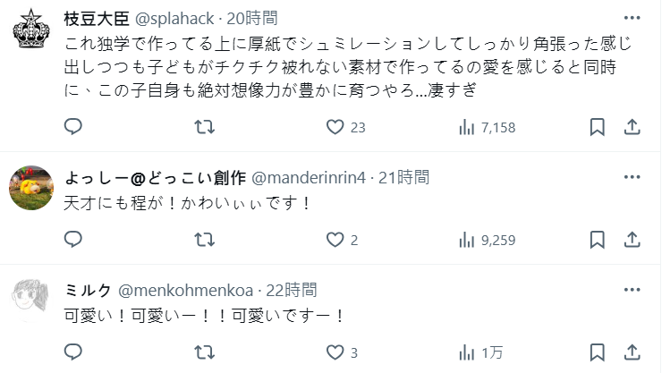 不少網友讚賞推主夫妻居然從零開始,無師自通這樣做出一件如此可愛的服裝,還讓小朋友穿上,真的是天才等級的創意,相信小朋友未來也是很有頭腦的小孩。