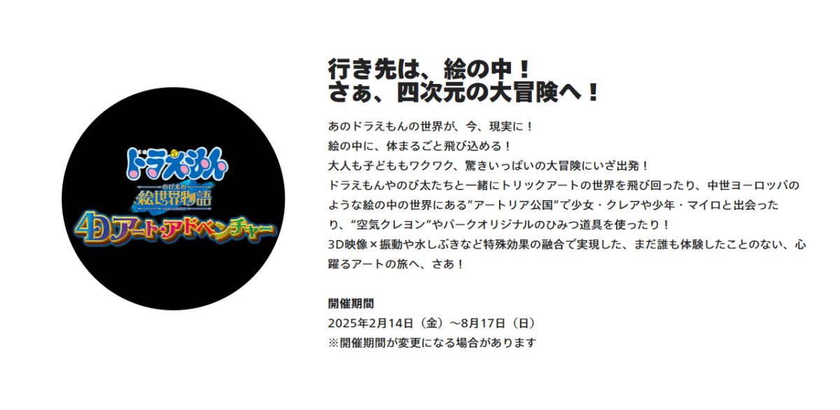 今日 ( 11/26 ) 也正式宣布與《哆啦A夢》合作,以 2025 年的《電影哆啦A夢:大雄的繪世界物語》( 暫譯,映画ドラえもん のび太の絵世界物語 ) 為題材,打造全新設施「哆啦A夢 4-D 藝術大冒險~大雄的繪畫世界故事~」給遊客全新體驗,將在 2025 年 2 月 14 日正式開幕。