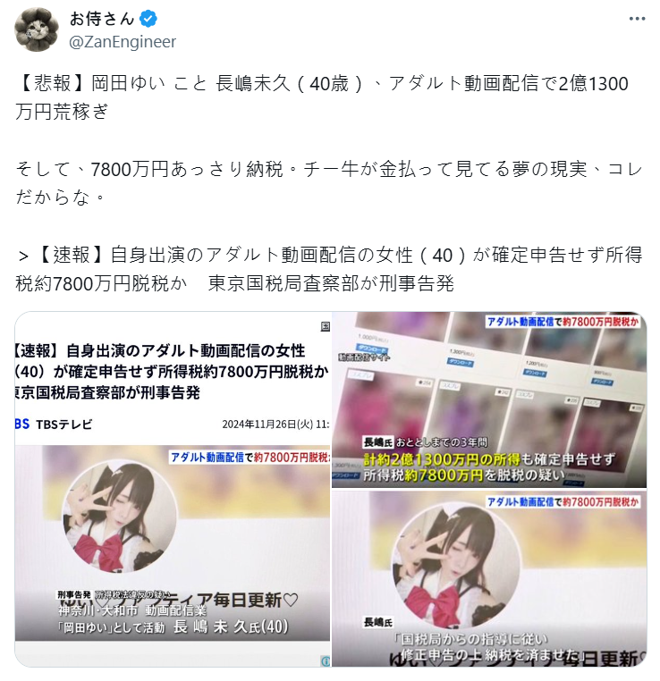 日本今日 ( 11/26 ) 有則震驚消息,一名透過在 Fantia 發佈成人影片來賺取收入的成人 Coser「岡田ゆい」,因未申報所得稅而涉嫌逃漏稅約 7800 萬日圓,遭到東京國稅局刑事告發,目前也被揭發本名,成為日本網路話題。