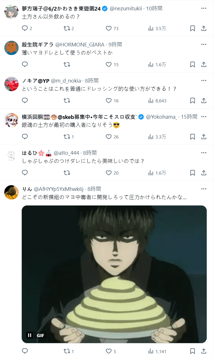 當然提到美乃滋,不提到這位可不行了,《銀魂》土方十四郎可是著名的「美乃滋星人」,各位看到這種商品,第一個想到的鐵定是土方了。