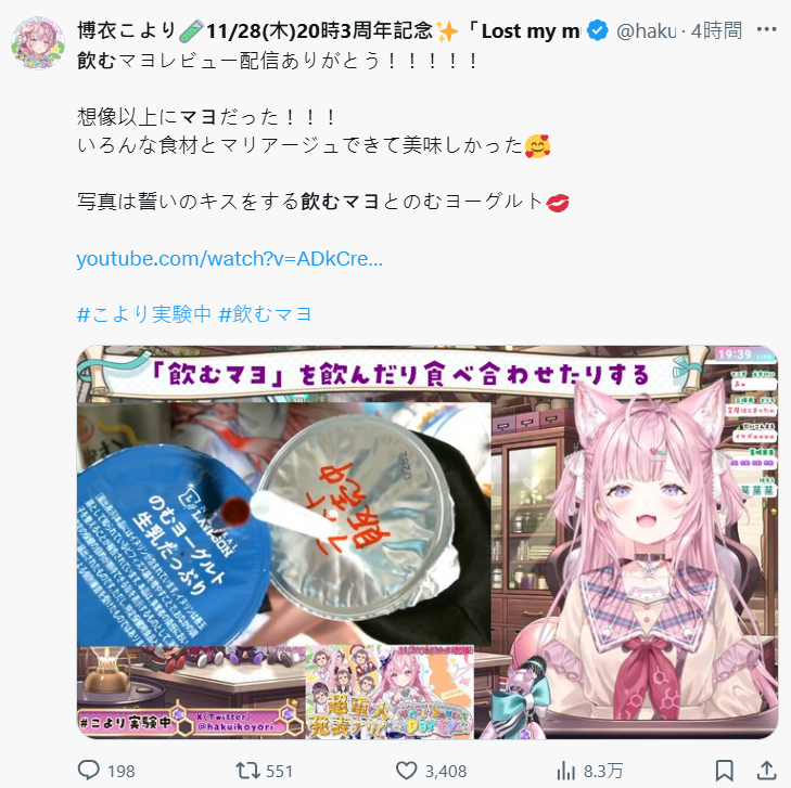 ▼ 連《hololive》博衣可佑理(博衣こより)也在開賣當天開試吃直播。