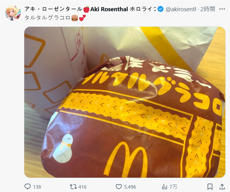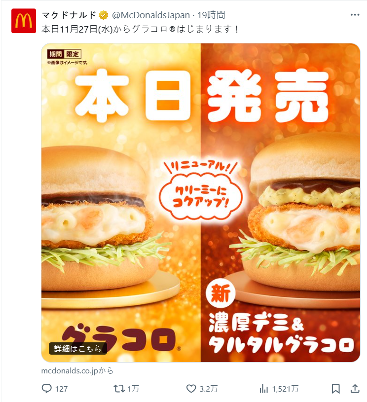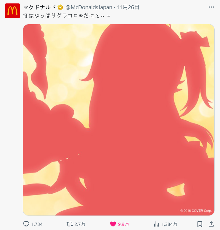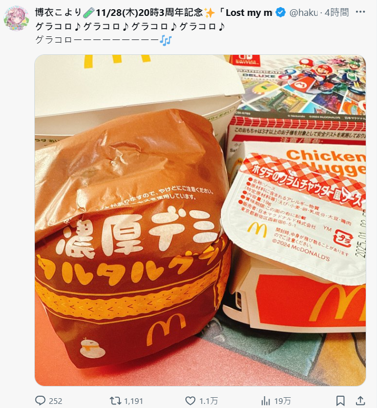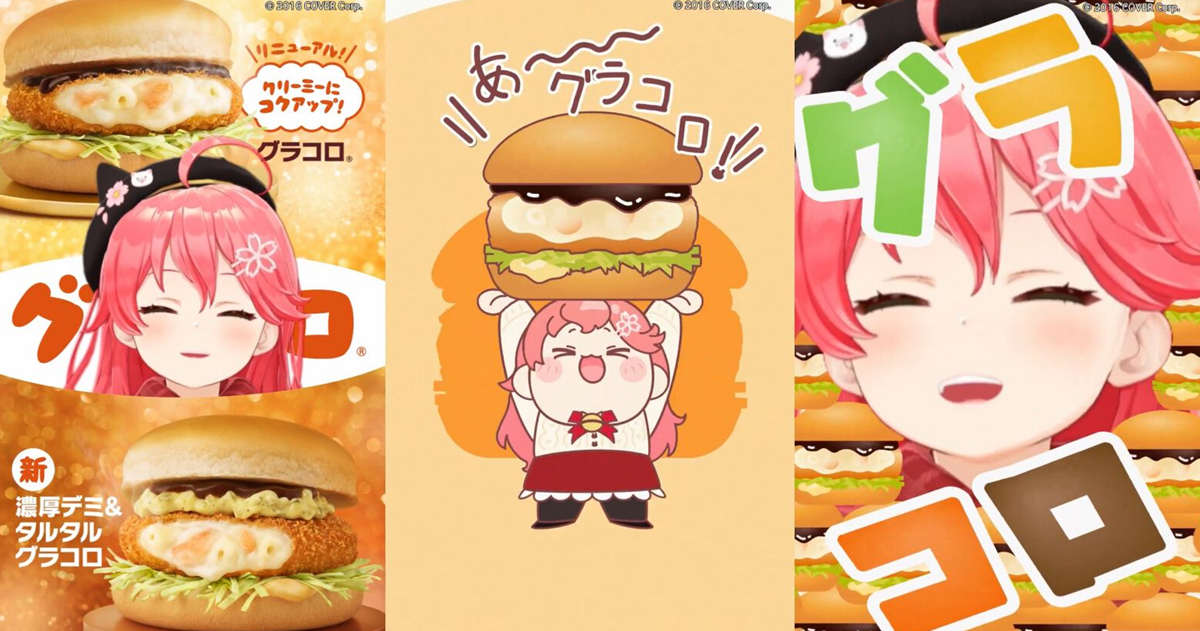 今日 ( 11/27 ) 為了宣傳開賣的每年冬季定番「奶油可樂餅漢堡」( グラコロ ),找來了《hololive》人氣 VTuber 櫻巫女(さくらみこ)合作,並請櫻巫女演唱宣傳影片,洗腦的旋律讓不少粉絲大為驚嘆,表明今天就想去吃麥當勞了 XD。