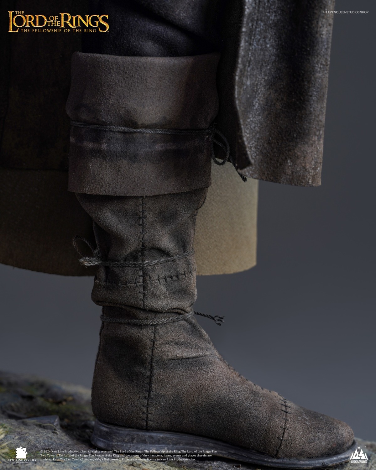 本作全高來到 85 公分(含底座),以他雙手持劍、直視前方的備戰姿態為題設計,整體姿態沈穩但散發出強者威嚴,採用樹脂、布料、金屬等複合式材料打造的亞拉岡也考究還原了他全身上下的裝備,包含銳利的長劍、綠色的精靈斗篷與別針、箭袋、精雕細琢的護手、腰帶,多樣材質與精美製作工藝堆疊出豐沛層次感與寫實感,加上以植髮技術完成的頭髮和鬍鬚、擁有逼真紋理的鉑金矽膠皮膚、傳神的雙眼與面部輪廓,充分捕捉演員維果·莫天森(Viggo Mortensen)當時的劇中神韻。