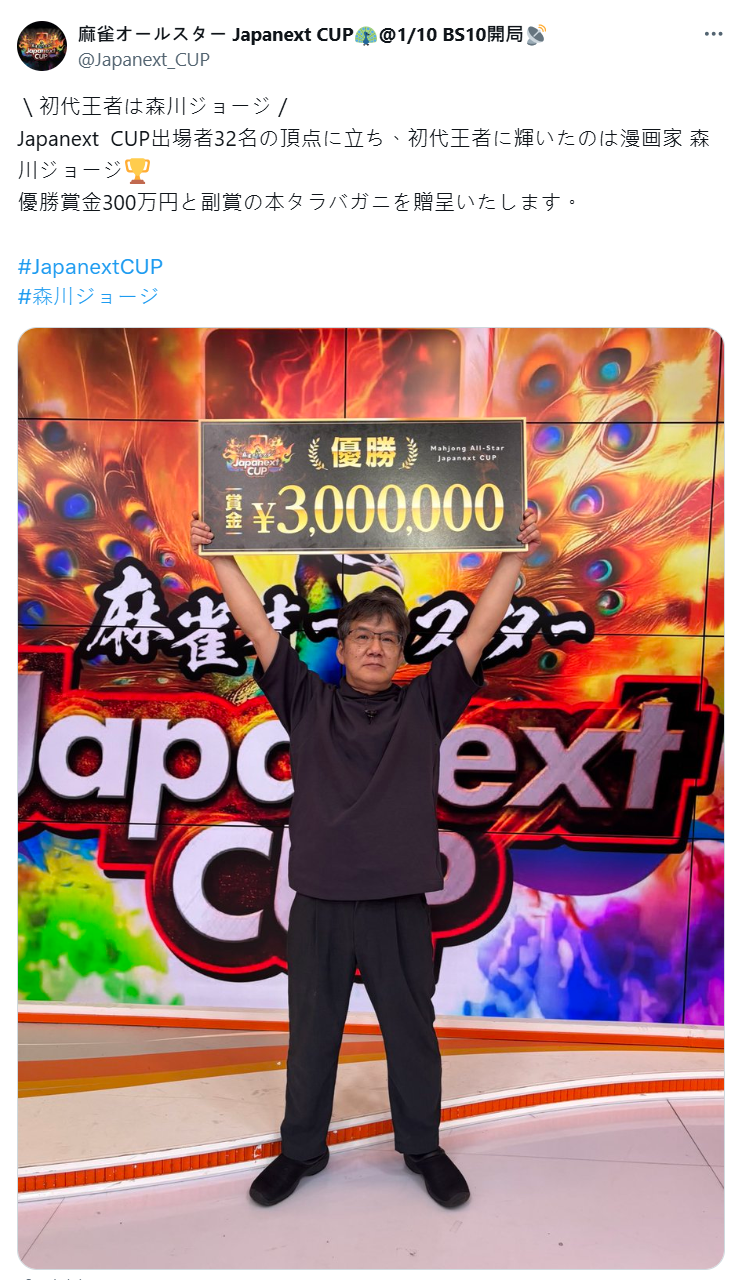 沒想到作者森川讓次參加了電視台舉辦的麻雀對戰錦標賽「麻雀全明星 Japanext CUP」,居然在其中甚至還有職業好手的競賽中,摘下冠軍,讓不少粉絲網友感到驚喜,沒想到森川老師的牌技如此強大。