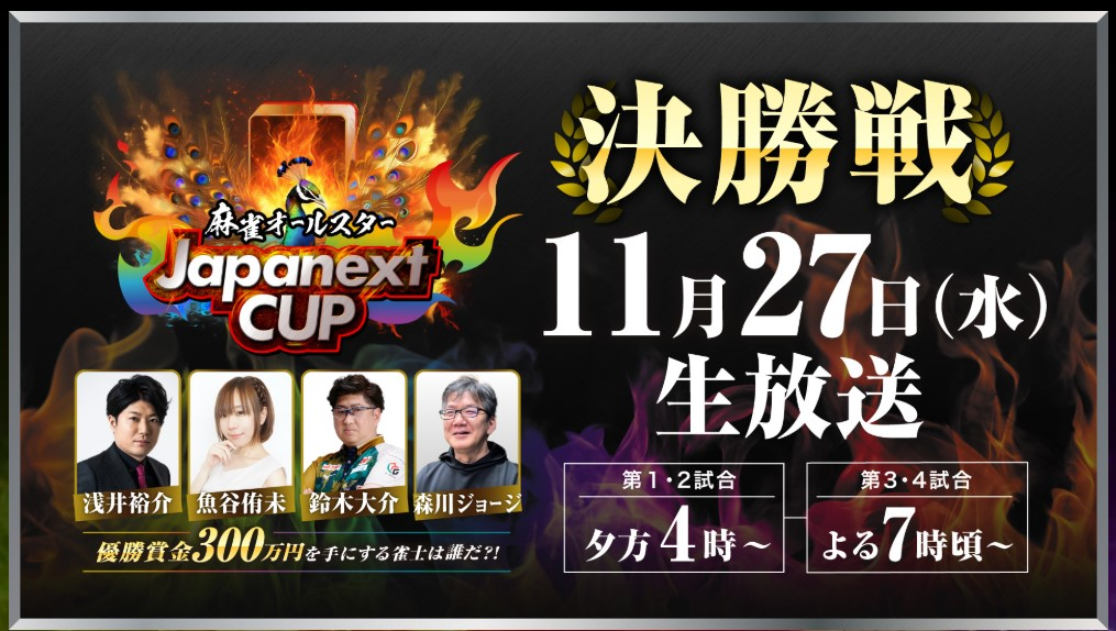 麻雀對戰錦標賽「麻雀全明星 Japanext CUP」為日本衛星電視 BSJapanext 舉辦,從今年1月展開,共集結 32 名頂尖選手,包括各大專業麻雀團體的冠軍得主和M聯盟明星選手。以「誰才是真正最強的麻雀將選手?」為主題,透過層層淘汰賽選出最終對決選手。
