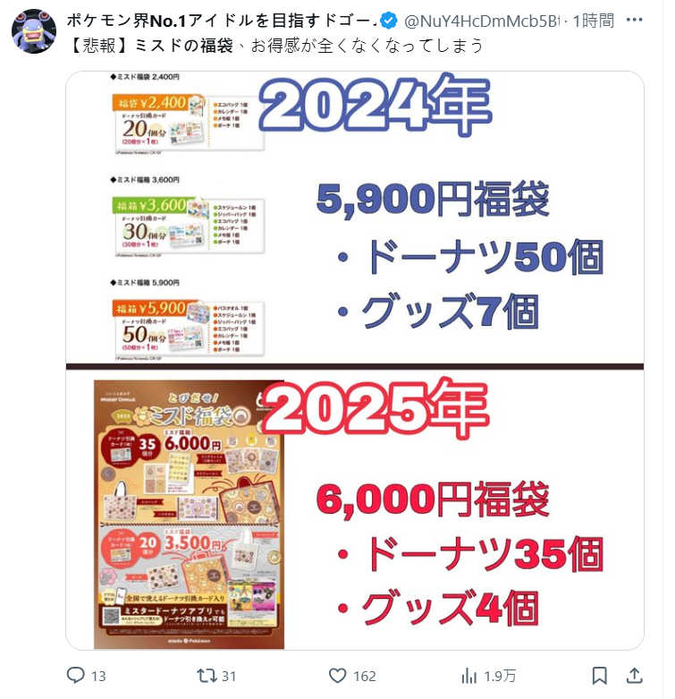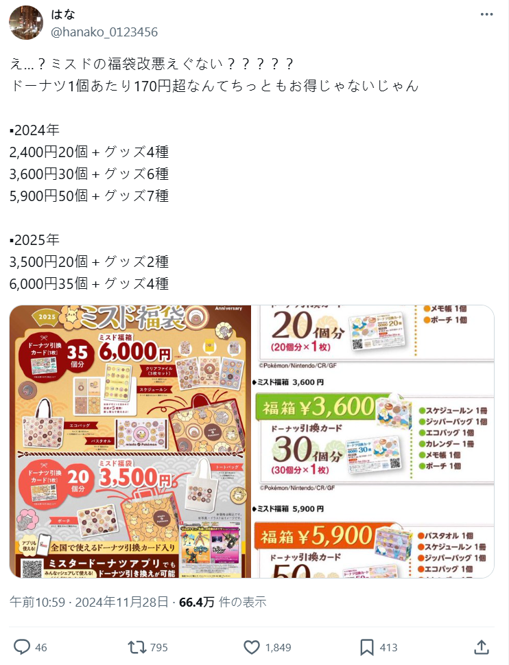 聖誕節前官方也在今日 ( 11/28 ) 釋出日本正月最具人氣的「福袋」,這也是 Mister Donut 每年定番跟寶可夢合作的活動,卻被網友發現今年福袋顯著「縮水」,讓人感嘆怎麼連福袋都不福了,成為 X 上的話題。
