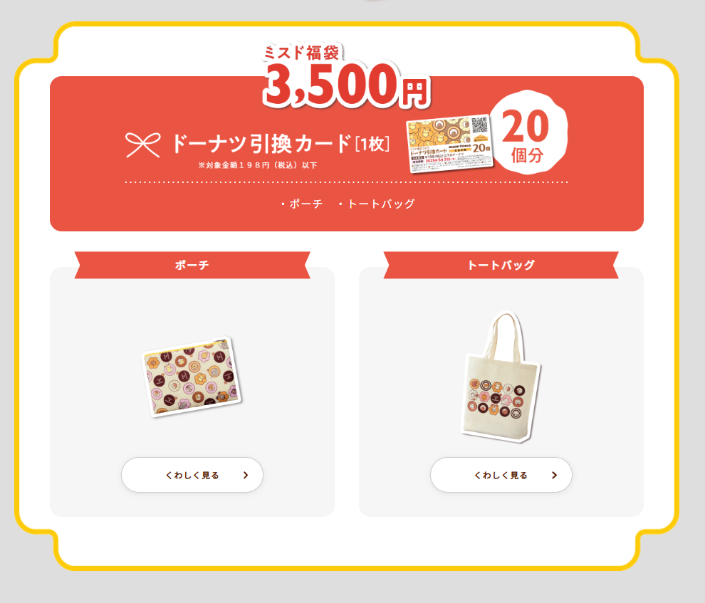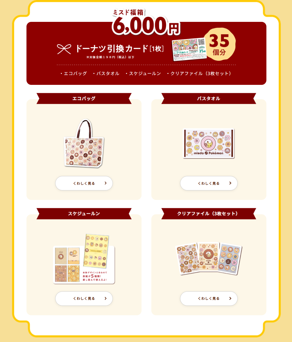 今年度推出的正月福袋中,分成兩種樣式,包含 6000 日圓的大福袋跟 3500 日圓的中福袋,當然內藏有大量的聯名周邊,包包、提袋、零錢小包、毛巾與資料夾等都收藏在福袋中,還附有多拿滋的交換券。