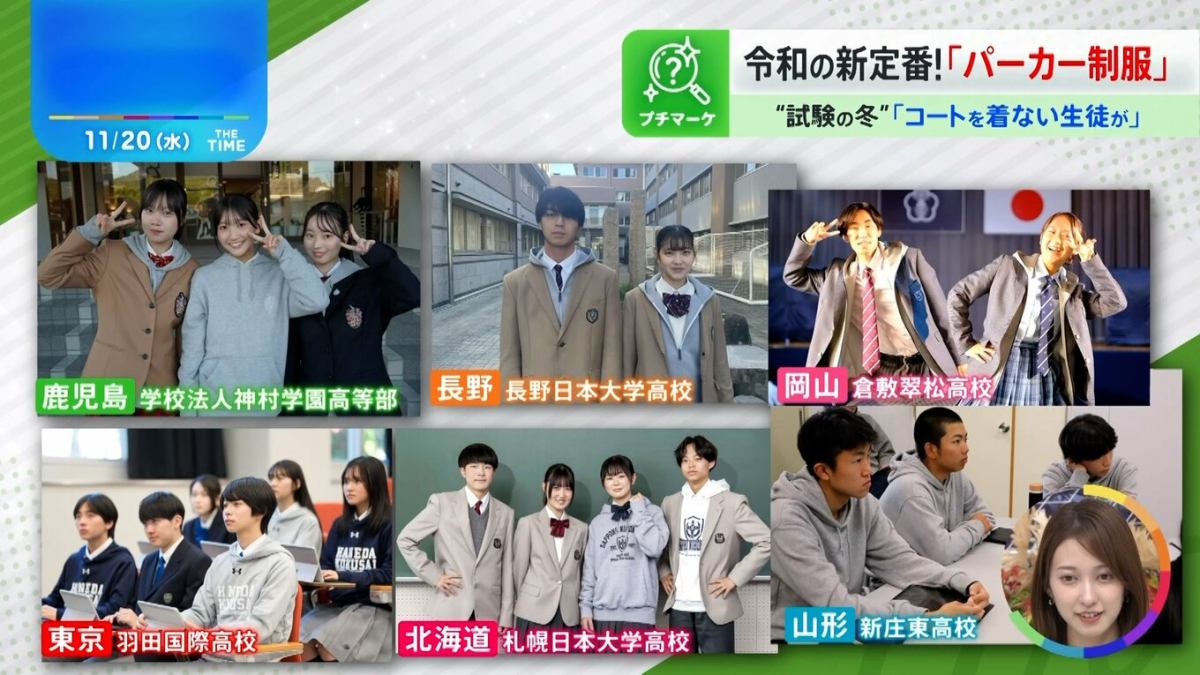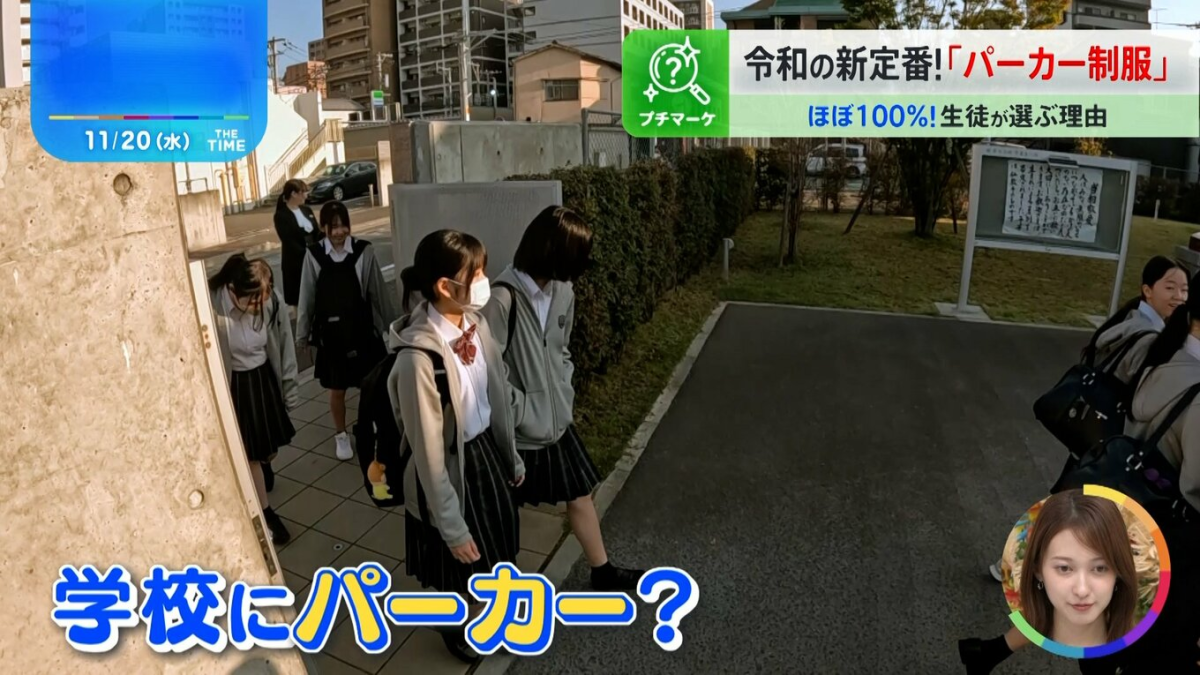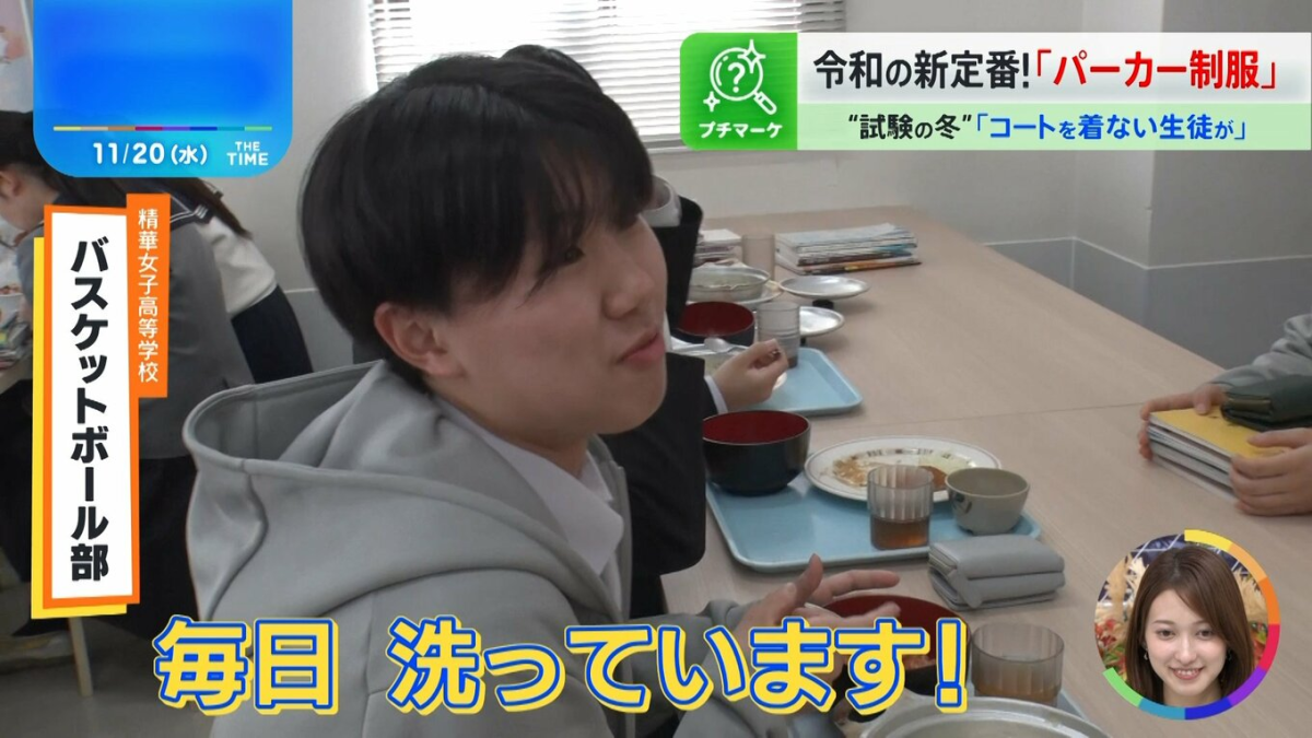 福岡市的精華女子高中自兩年前開始採用胸口帶有校徽刺繡的連帽外套作為制服。談到原因,老師牧野美佐紀解釋:「穿大衣對很多學生來說太重又麻煩,最後乾脆不穿,結果容易感冒。相比之下,連帽外套輕便又容易搭配,非常實用。」