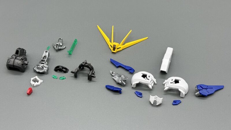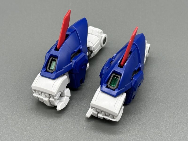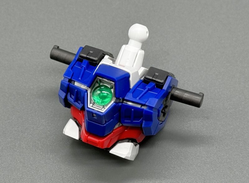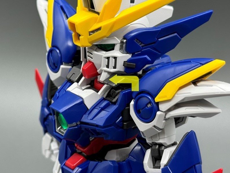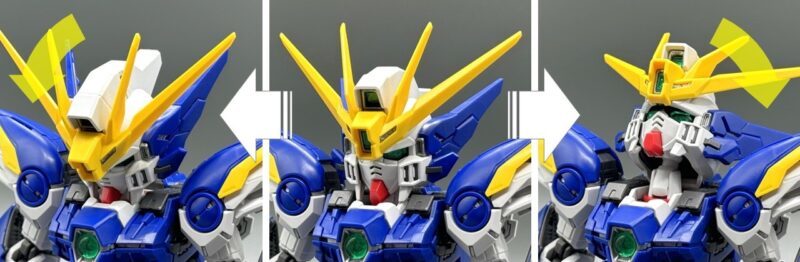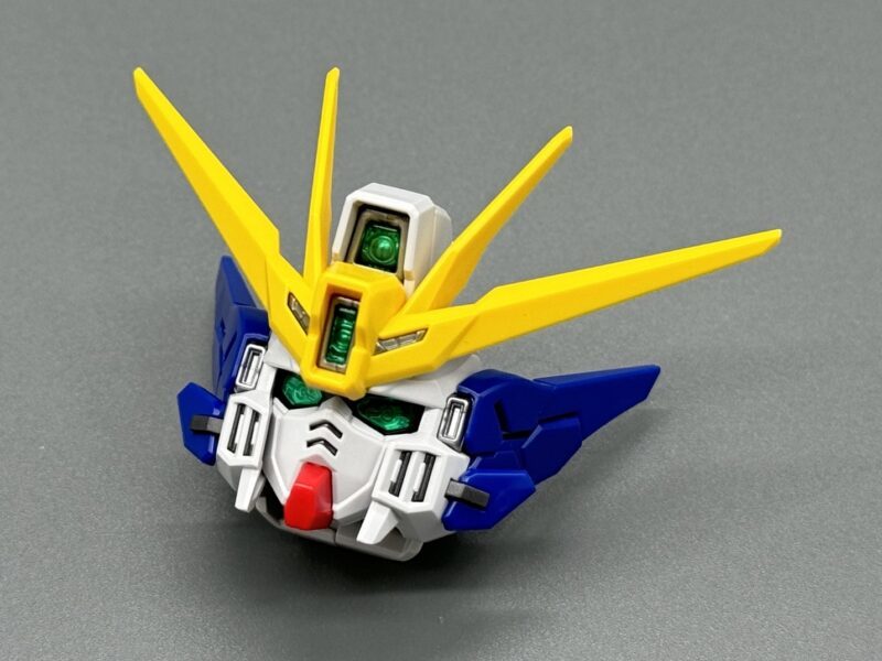 ▼ 「MGSD 飛翼鋼彈零式EW」的頭部由黃、藍、白、銀、紅、黑、透明綠等多種成型色零件構成,素組便有極高的完成度。其中頭頂、額頭、雙眼等處的攝影機使用了銀色、透明綠零件的雙層結構,內部使用「擬真金屬光澤質感零件」表現金屬質感與精密的感測元件造型,加裝上外側透明零件後便能透出精密內構。