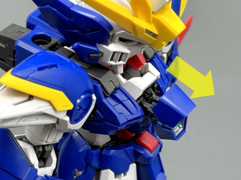 ▼ 雙臂也運用了數量豐富的零件構成,表現靈活可動關節、各部裝甲色彩與層次,其中肩甲最內側使用銀色零件表現內構,前腕手甲上的感測器使用了透明綠零件再現。