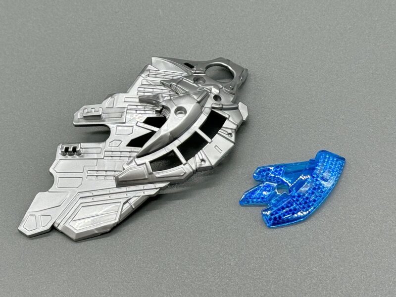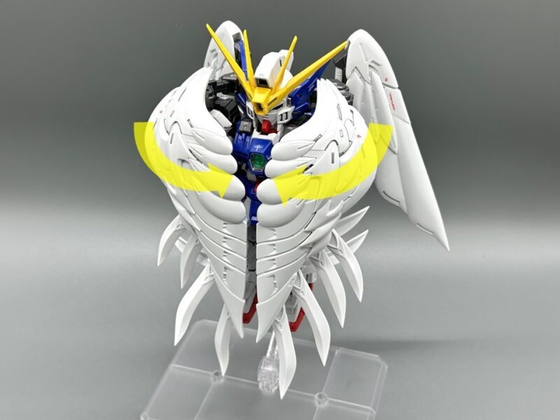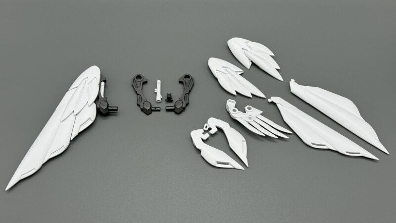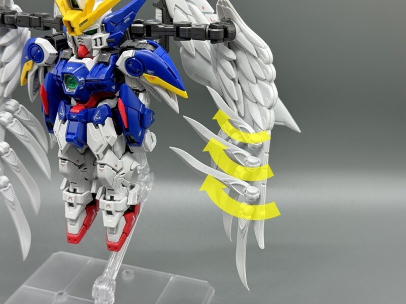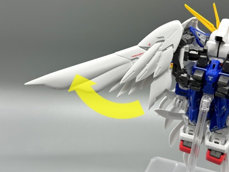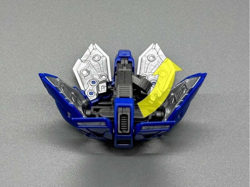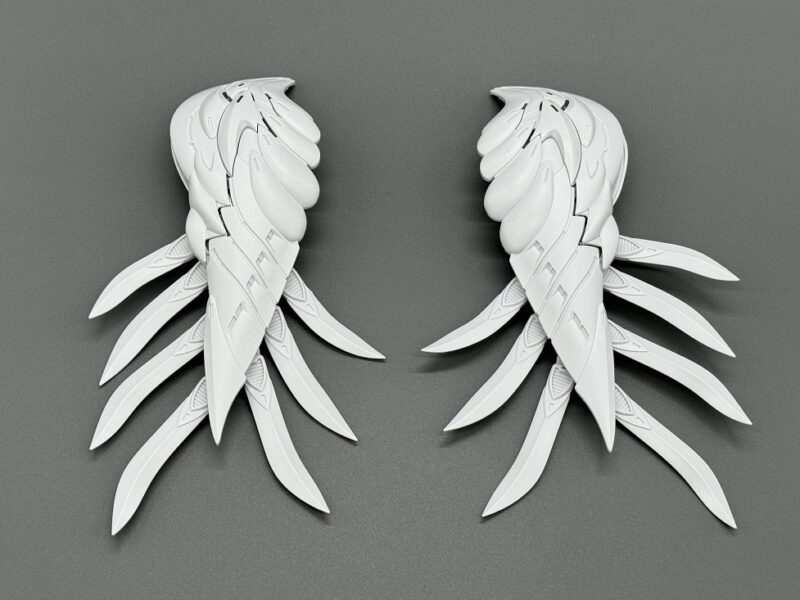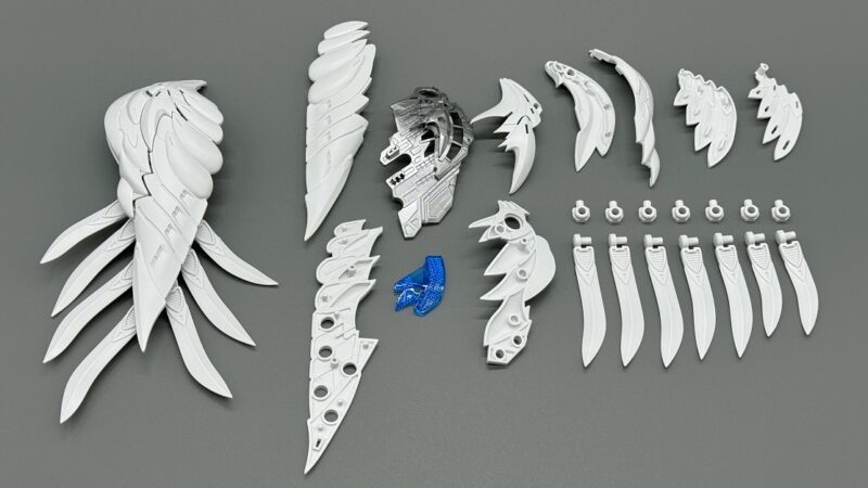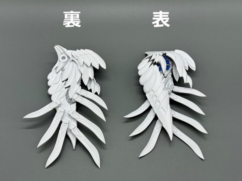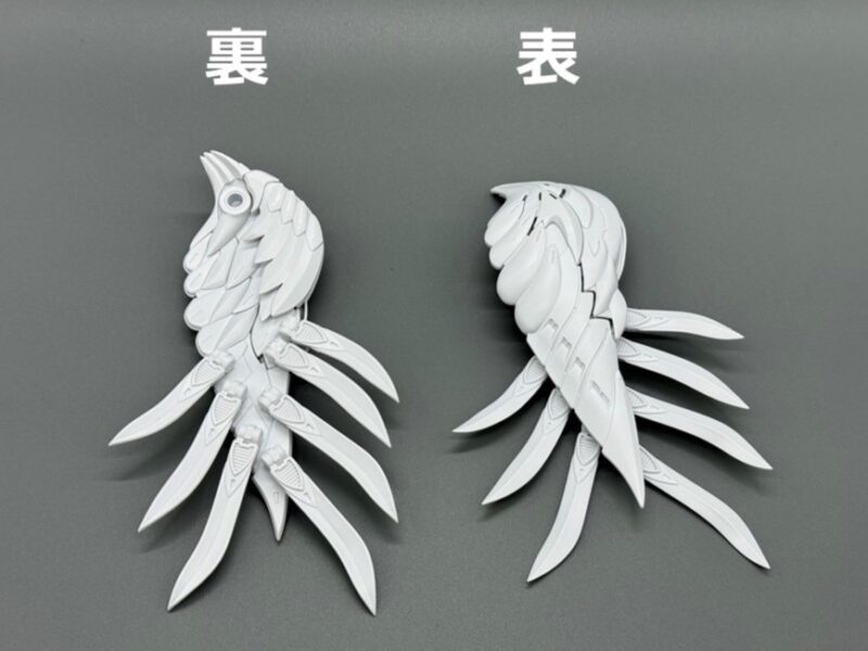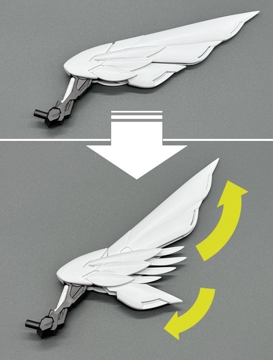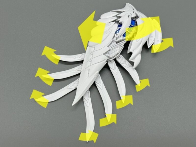 ▼ 而主翼更是採用包含內構造型的五層構造製成,下方七枚羽毛零件各自獨立可動,上方裝甲更具備露出內構的展開機構。內部構造不僅有「擬真金屬光澤質感零件」表現的金屬骨架,還有模型原創的透明藍部件。這個透明藍零件採用提升光線反射率的蜂巢結構製作,能夠呈現彷彿發光的質感。