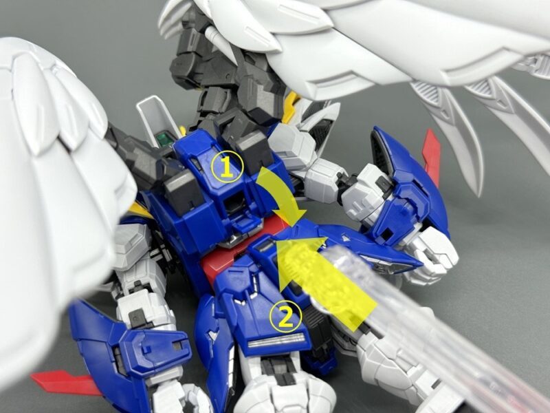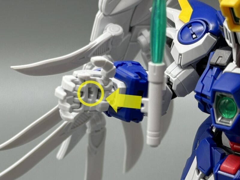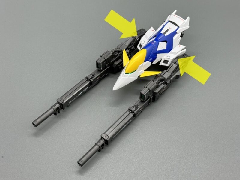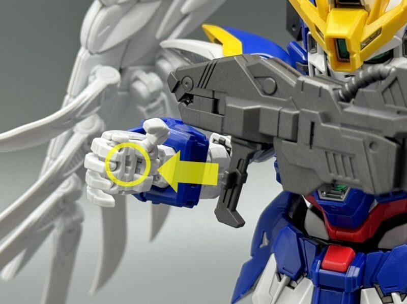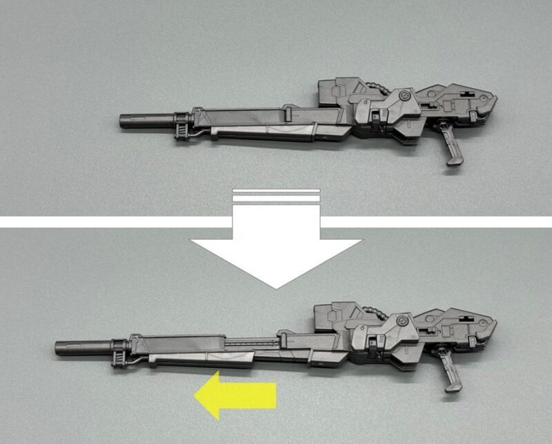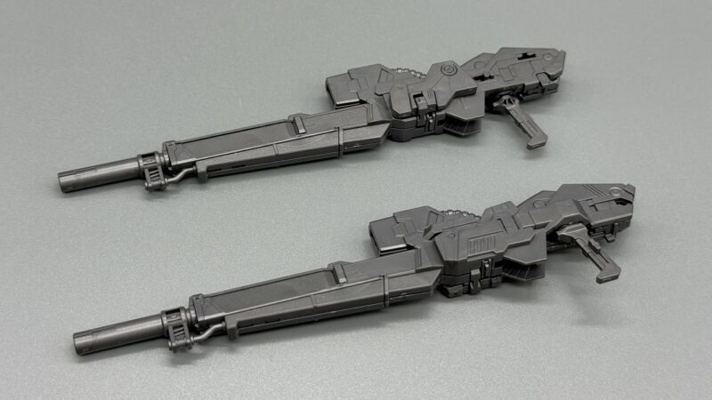 ▼ 武器的「雙重破壞步槍」具備槍管伸縮機構以及雙槍合併機構,在槍托末端還設有連接零件,能夠固定在手甲內藏的卡榫,提升飛翼鋼彈零式 EW 持槍的穩定度,藉此把玩出雙手持槍旋轉射擊、合併雙槍使用最大出力射擊的經典場景。