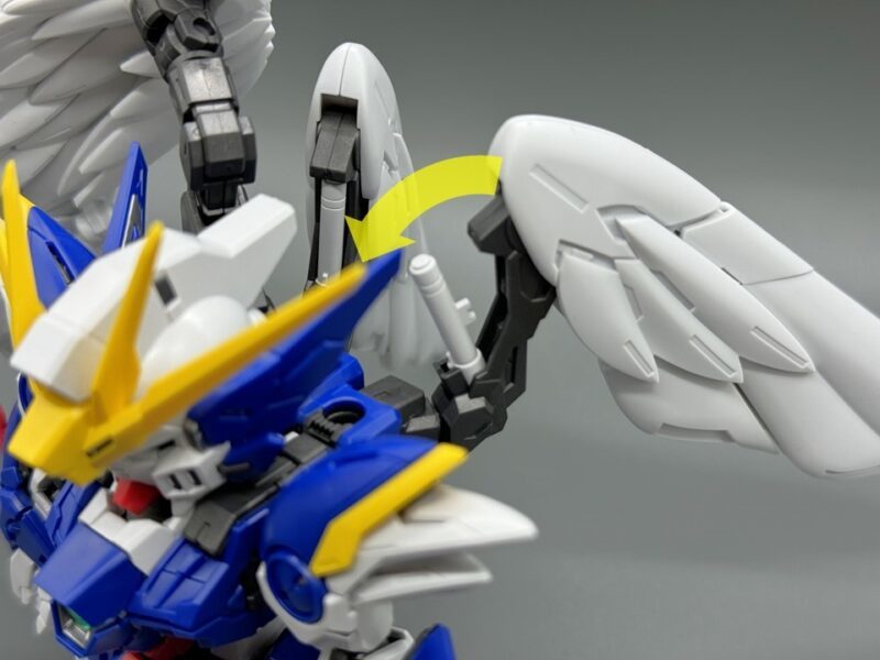 ▼ 背包部分為了強化裝上巨大雙翼後的強度,與本體的連接採用鑲入後便無法拆卸的結構。兩側連接雙翼的支架具備多軸可動關節,可朝向多方向轉動。