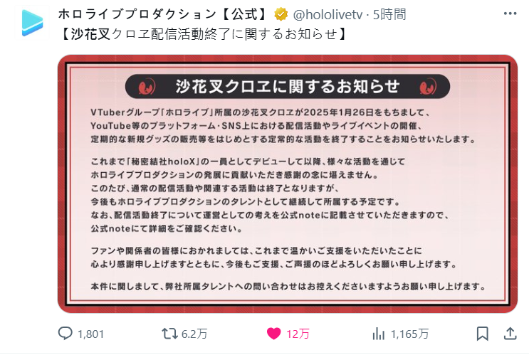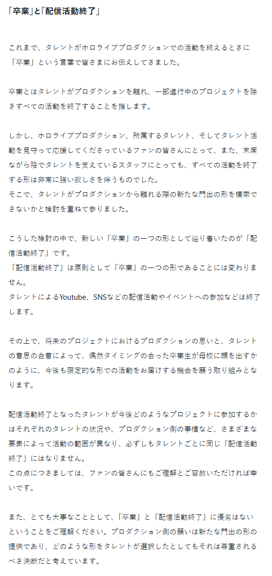 另外,hololive 官方此次也宣布未來將新增一種稱為「結束配信活動」的機制,作為旗下成員離開時的一種選擇。( 其實 10 月 EV 的華生·艾米莉亞也是同樣的作法 )