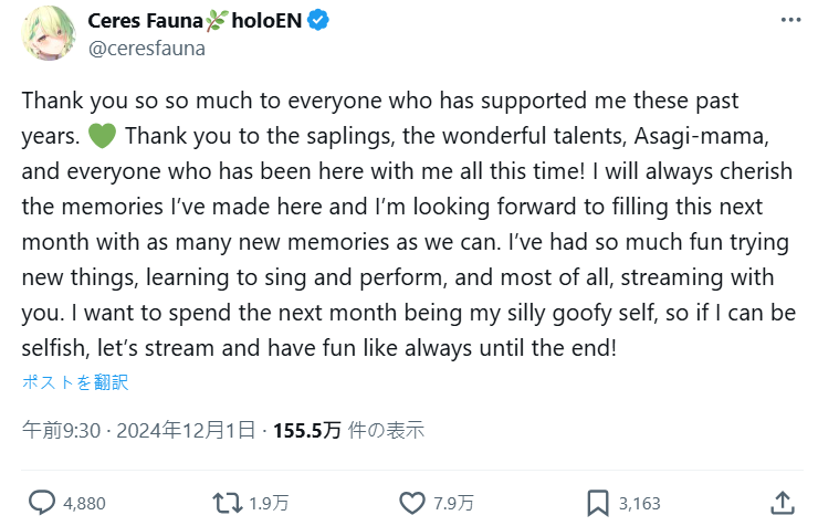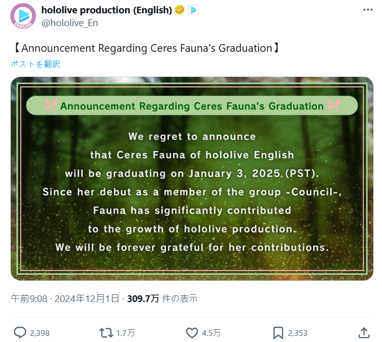 日本 Vtuber 經紀公司品牌 HoloLive 旗下的『Hololive English -議會-』 ( 現為 Promise ) 成員「自然」Ceres Fauna ( セレス・ファウナ ),在今日 ( 12/1 ) 的重大告知直播上宣布即將畢業,活動將會持續至 2025 年 1 月 3 日為止。